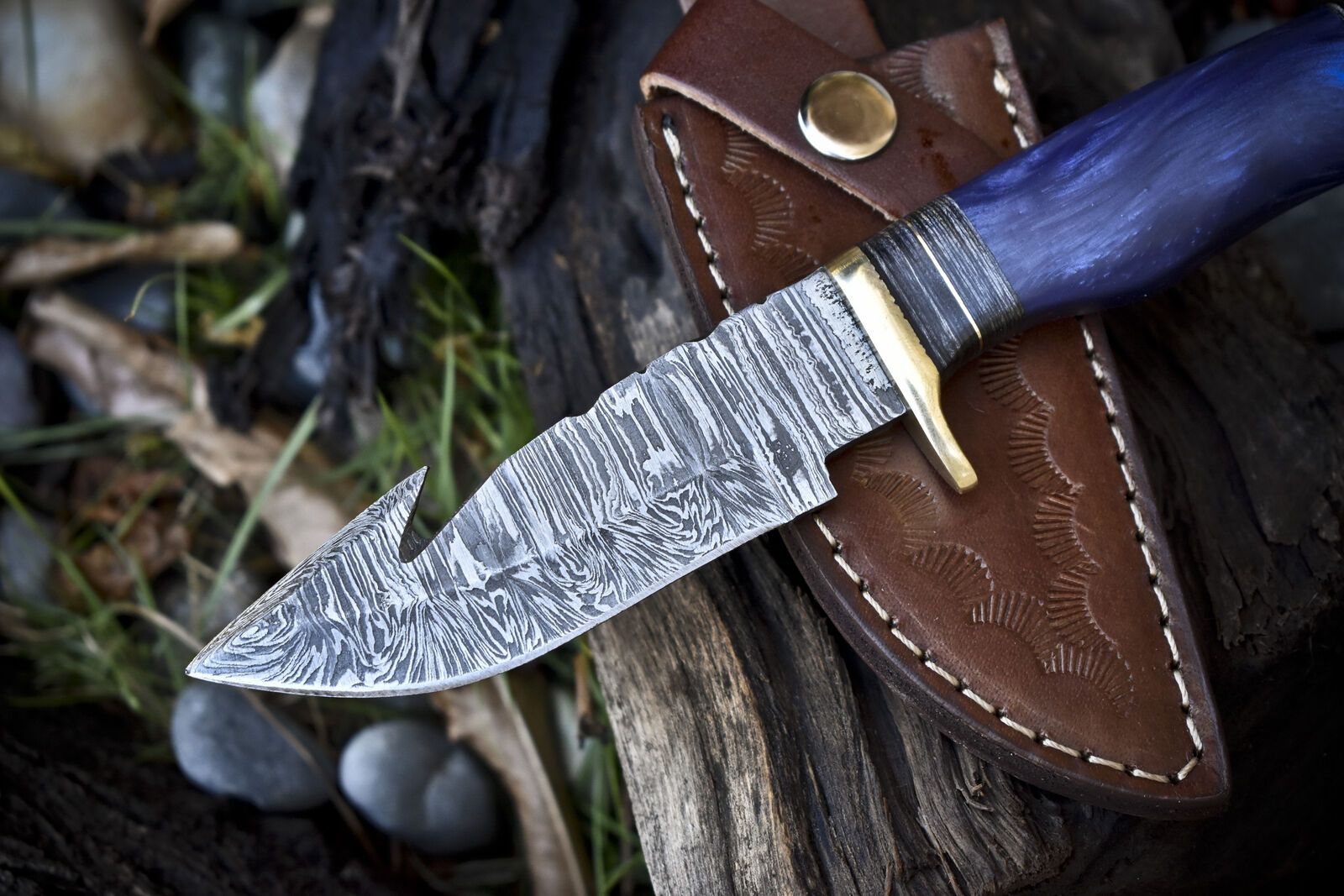 Custom Forged Skinner Knife with Gut Hook Twist Damascus Corian Handle for Hunting and Survival