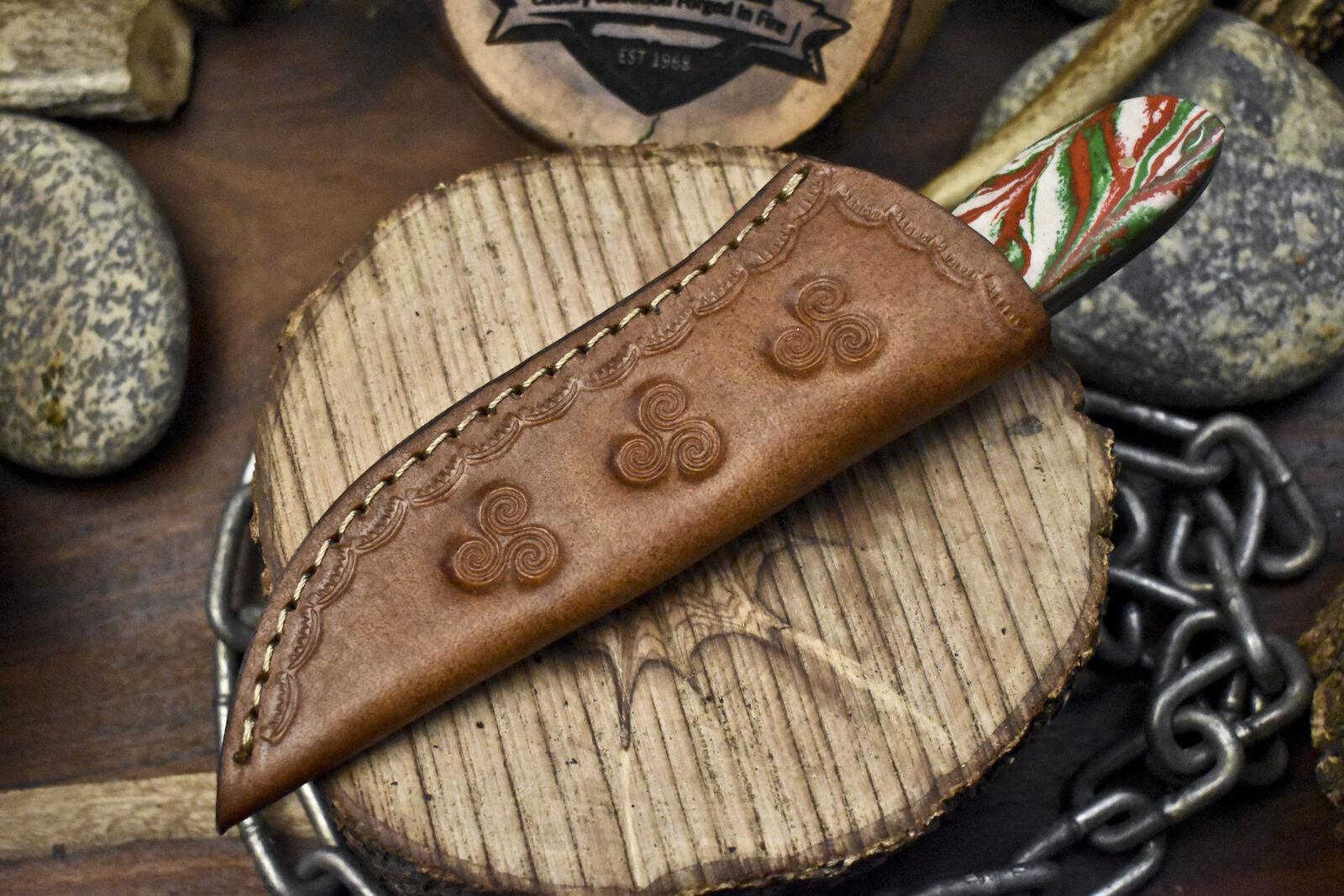 This custom forged Damascus steel skinner knife blends exceptional craftsmanship with rugged performance for hunters and outdoor enthusiasts. Measuring 8 inches overall, it features a 4-inch twist-pattern Damascus blade forged from a combination of 1095 high carbon steel and 15N20 nickel steel. The steel is folded multiple times to create 200+ distinct layers, then oil tempered to a hardness of 58–60 HRC for superior strength, sharpness, and edge retention. The bold twist pattern displays deep blacks and bright silvers in a swirling motion, creating a unique and timeless look. The 4-inch micarta handle, paired with a polished wooden bolster, offers a secure, comfortable grip for precision skinning and field dressing. This fixed-blade skinner is perfectly balanced and built for real-world use in hunting, camping, and survival situations. Each knife is 100% handmade, ensuring no two are exactly alike. A premium hand-stitched leather sheath is included for safe storage and easy carry, making this skinner knife a reliable and visually striking tool for your gear collection.