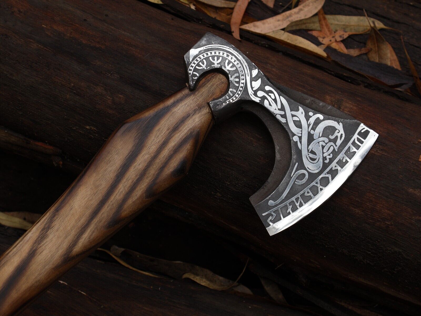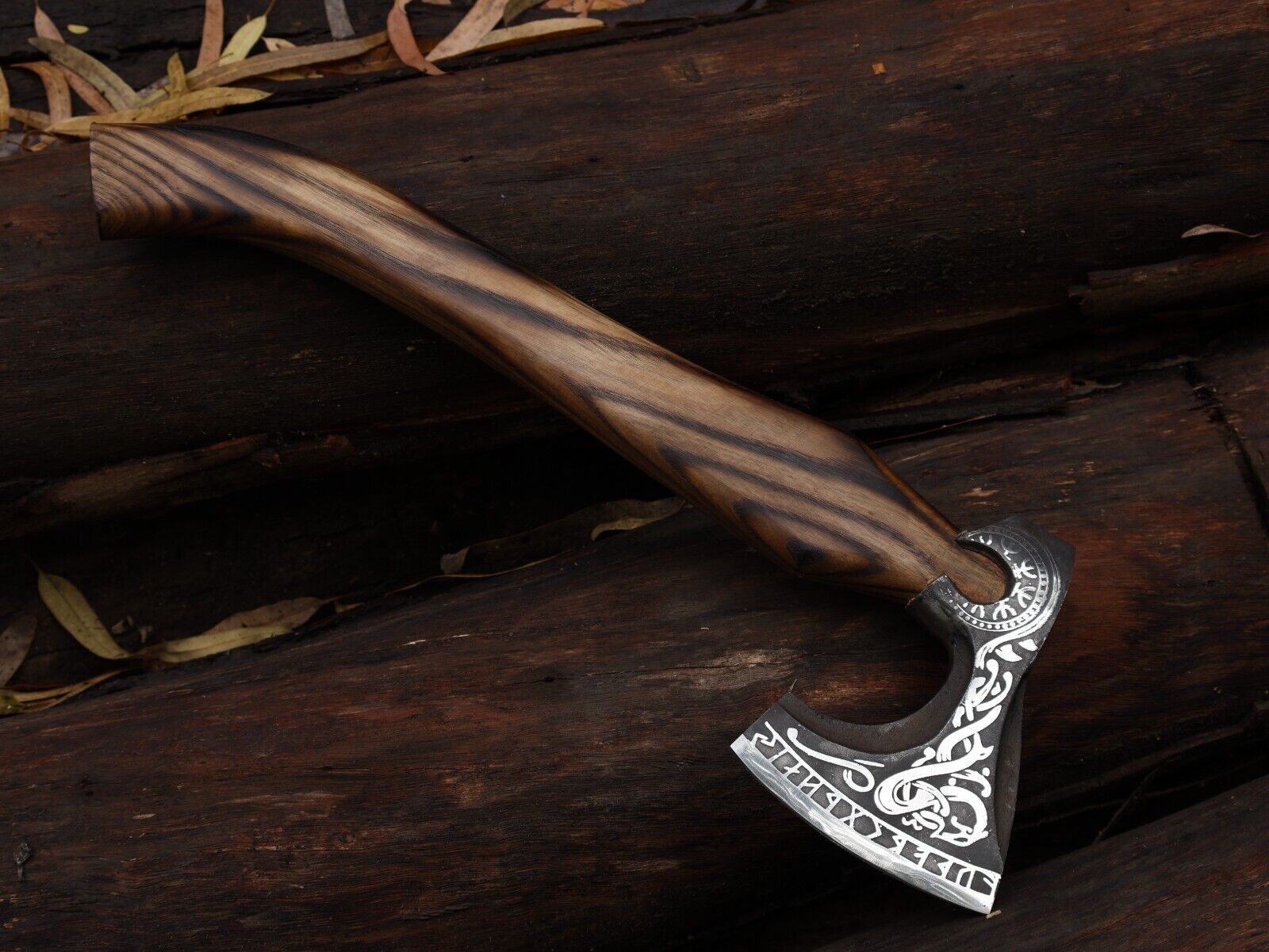 This custom handmade Viking axe is forged from premium carbon steel, blending strength, durability, and traditional craftsmanship. The axe features an 18-inch overall length with a 6.5-inch wide head and a 4.5-inch sharp cutting edge, making it an ideal tool for chopping, throwing, hunting, camping, or display. The handle is crafted from natural ash wood, engraved for comfort and style, providing excellent balance and grip during use. The blade is hand forged from over 270 layers of 1095 and 15N20 high carbon steels, enhanced with nickel layers and heat treated to a hardness of 56–57 HRC for lasting sharpness. Each axe comes with a thick, hand-sewn leather sheath to ensure safe storage and portability. Combining Norse artistry with functional performance, this Viking tomahawk is both a reliable outdoor tool and a collectible gift for enthusiasts, hunters, and history lovers alike.