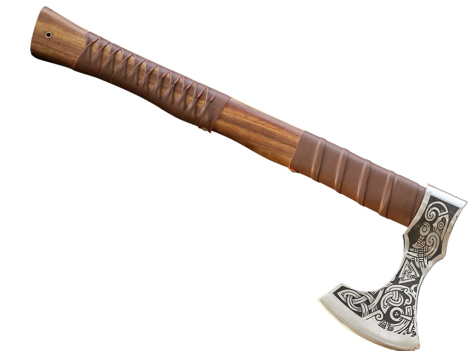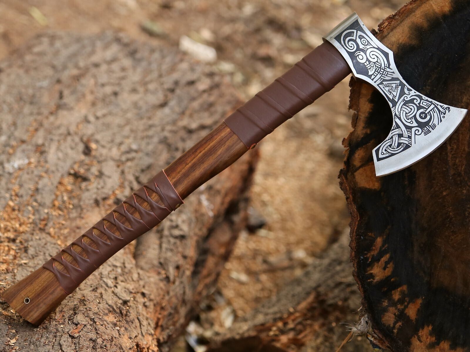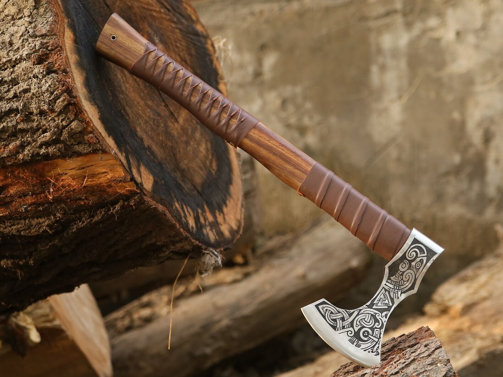 This custom gift forged handmade carbon steel viking axe is a perfect blend of artistry, craftsmanship, and practicality. Hand-forged with a durable high carbon steel blade, this viking battle axes inspired piece features a bearded hatchet design with a solid wood handle, providing strength, balance, and a comfortable grip. The cutting edge is meticulously hand-forged, while the handle is treated with oil and hard wax, enhancing its natural beauty and durability. Perfect for camping, outdoor adventures, or as a collector’s display, this viking fighting axe and viking combat axe captures the authentic look and feel of historical vikings battle axe and viking dane axe designs. The included custom leather sheath protects the blade and fits securely, making it safe and convenient to carry. With elements reminiscent of steel city axes, the steel woods axe, and a cold steel axe head cane inspired style, this axe is both functional and visually striking. Ideal for anyone seeking a two handed viking axe or viking war axes replica, it combines utility, aesthetics, and collectible appeal. A must-have for enthusiasts, campers, and history lovers alike.
