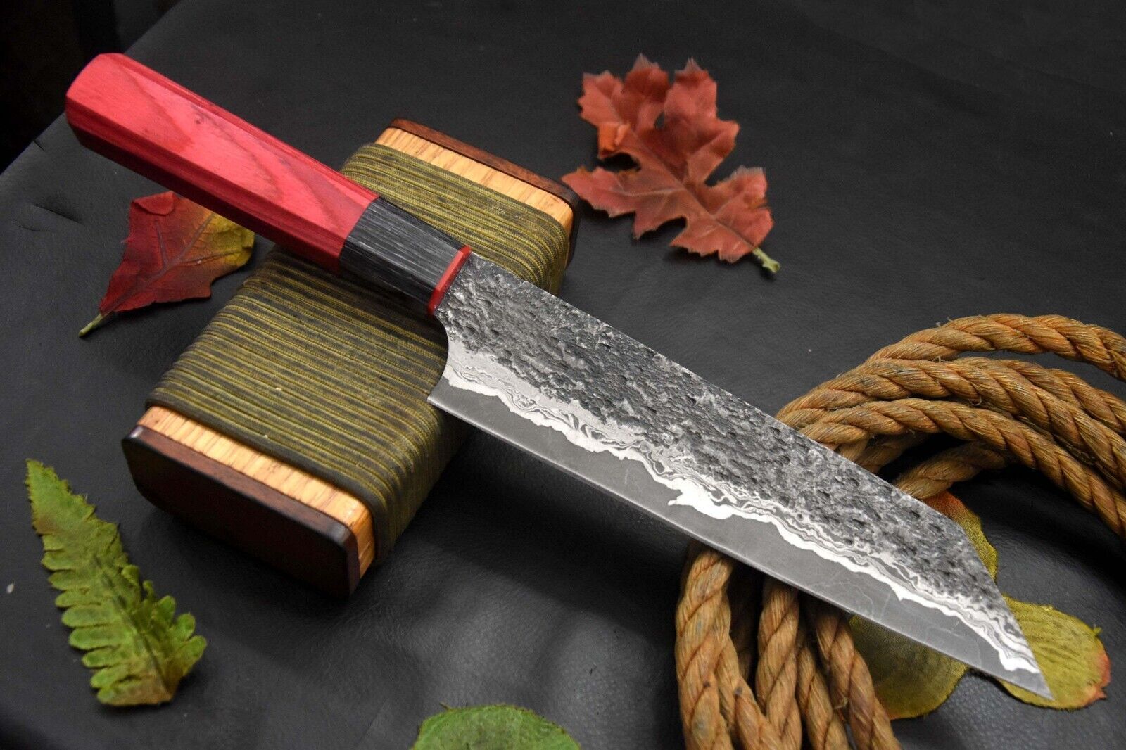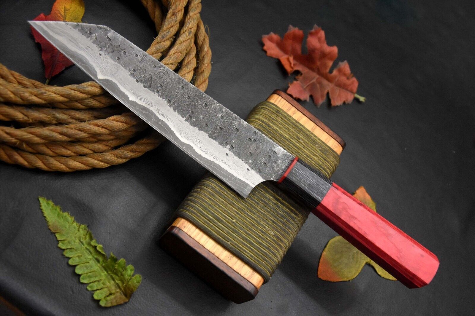 Custom Handmade Hammered San Mai Damascus Steel Chef Knife designed for precision, durability, and elegance. The blade is hand-forged from premium San Mai Damascus Steel, known for its exceptional edge retention, strength, and striking hammered finish. Measuring 8 inches in blade length with a straight edge, it ensures effortless slicing, chopping, and filleting. The 5-inch wooden handle is carefully crafted for a secure and comfortable grip, featuring a full tang design for perfect balance and control. This chef knife is versatile, making it suitable for professional kitchens, outdoor cooking, camping, and survival use. Every knife showcases a unique Damascus pattern due to its handmade craftsmanship, ensuring no two pieces are identical.