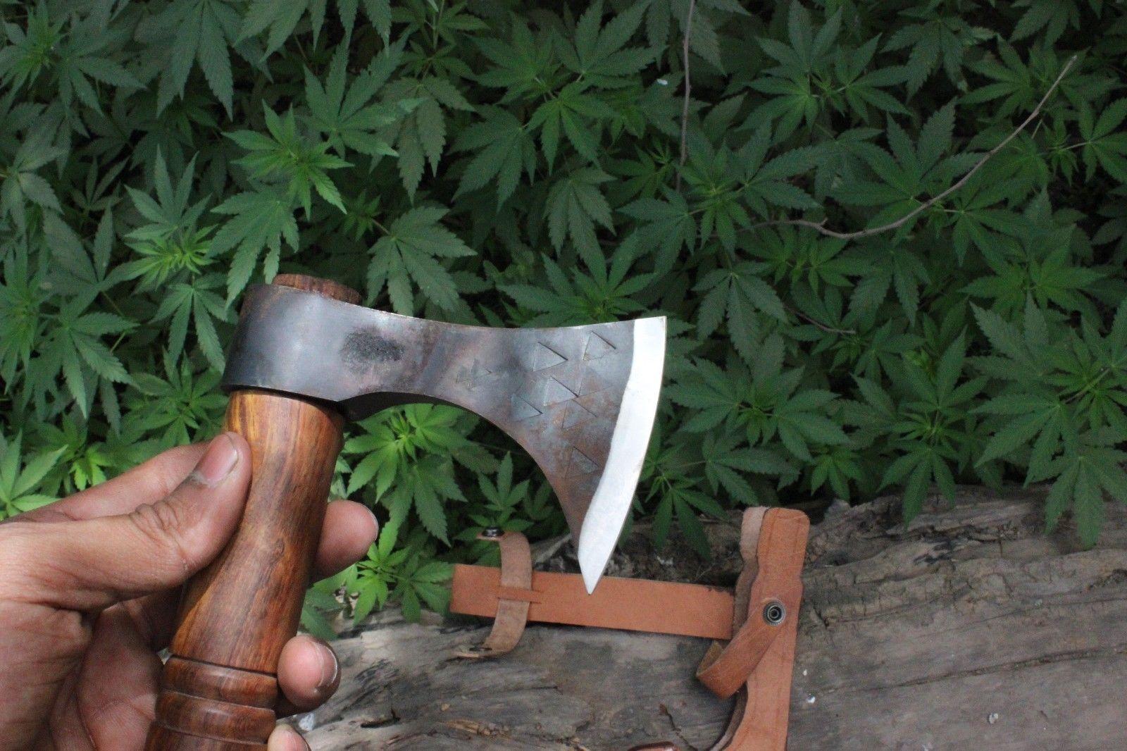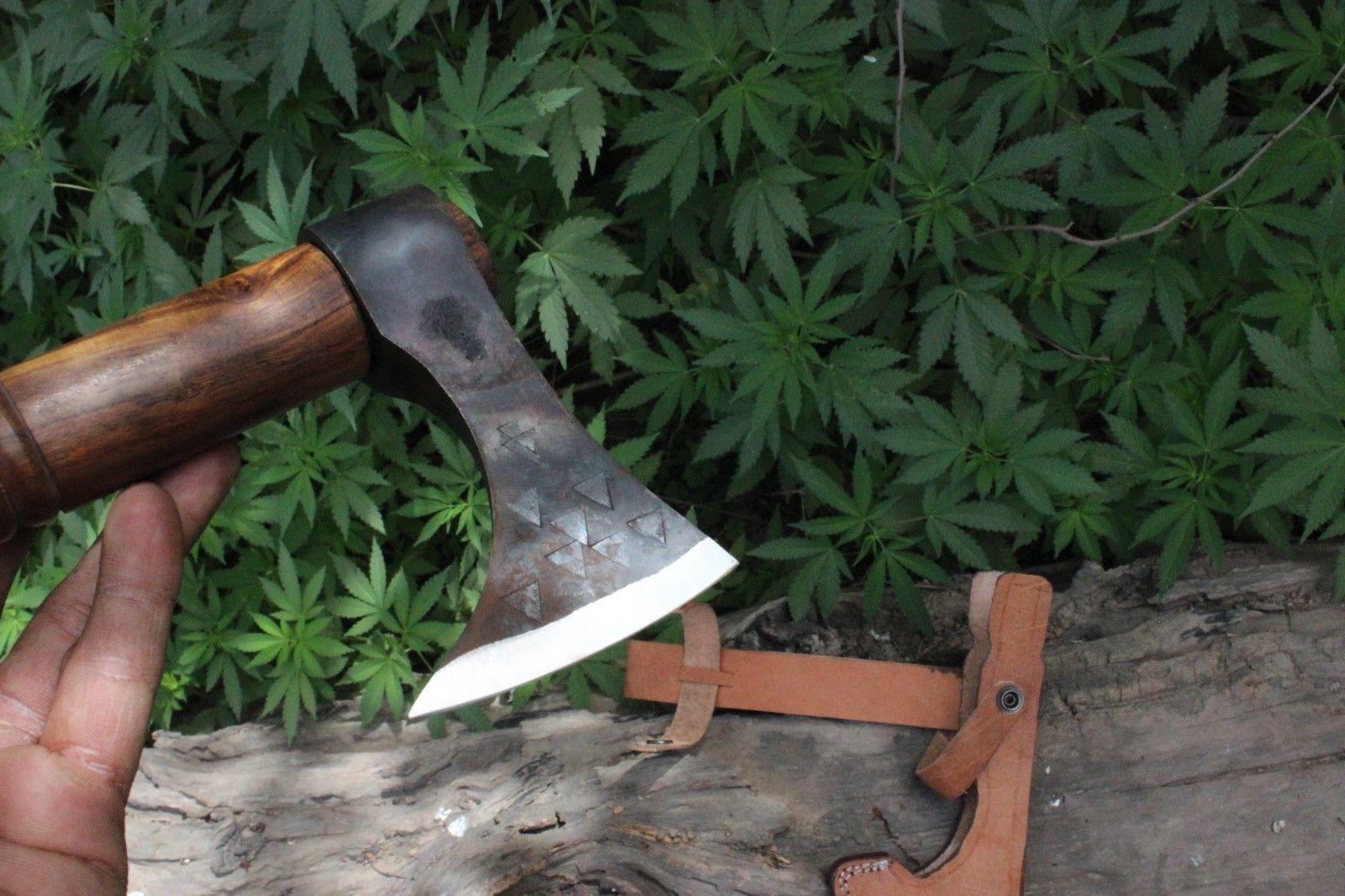 This custom hand forged Viking birded tomahawk is a stunning example of traditional craftsmanship combined with modern durability. Made from high-quality 1095 high carbon steel, the axe head measures 5 inches in length with a 3.5-inch cutting edge, designed to deliver both strength and precision. The overall length of the tomahawk is 17 inches, making it a versatile size for display, collection, or practical outdoor use. The blade is heat treated to a hardness of 59 HRC, ensuring excellent edge retention and resilience under heavy use. A beautiful walnut wood handle complements the forged head, offering a secure grip and timeless appeal. The axe also includes a handcrafted leather sheath, providing protection and safe portability. Each tomahawk is forged by hand using traditional methods, shaped on an anvil and finished without the use of machines, ensuring every piece is unique. With its drifted tear-drop eye, the head fits securely onto the handle, making it both functional and historically authentic. Whether you are a collector of Viking-era weapons, a reenactor, or someone who appreciates fine hand-forged steel, this Viking birded tomahawk is a piece that combines artistry, functionality, and heritage.