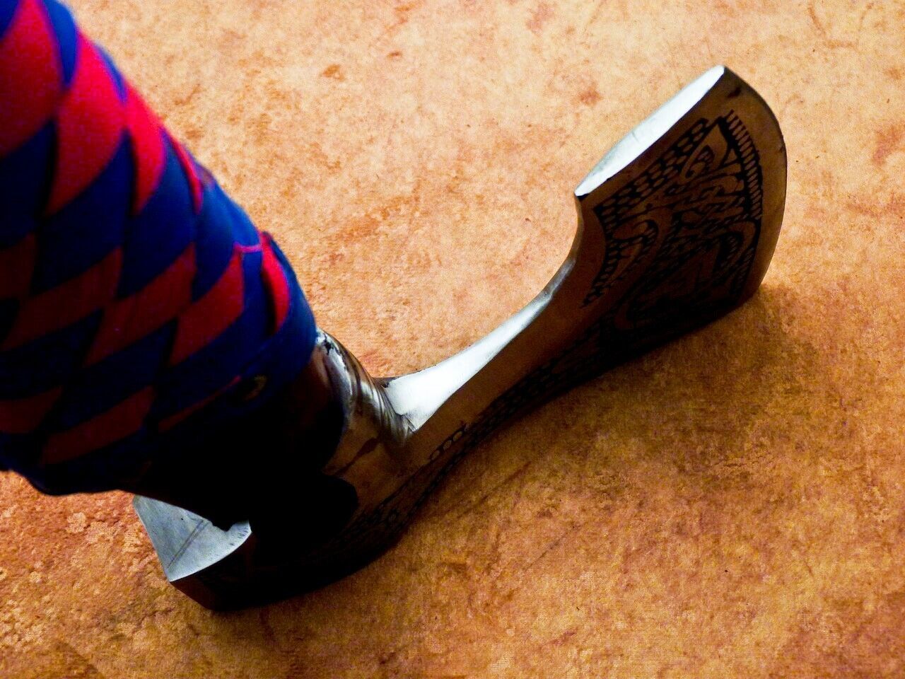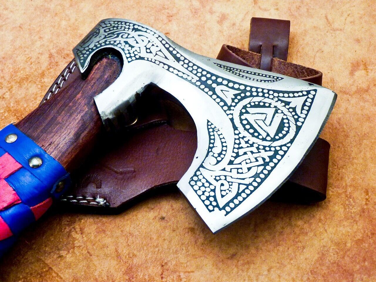 The natural wood handle is oil-treated for longevity and wrapped in genuine leather for a comfortable, non-slip grip. The axe head is skillfully forged with engraving, etching, and carving, giving it a rustic Viking appeal with an antique patina finish. Each axe is individually handmade, so every piece is unique in wood grain and detailing while maintaining the same high-quality construction.
