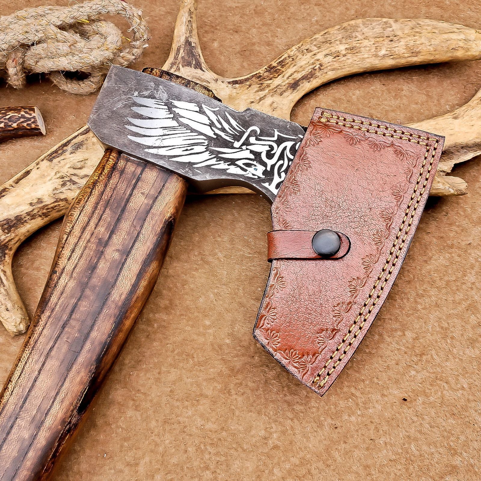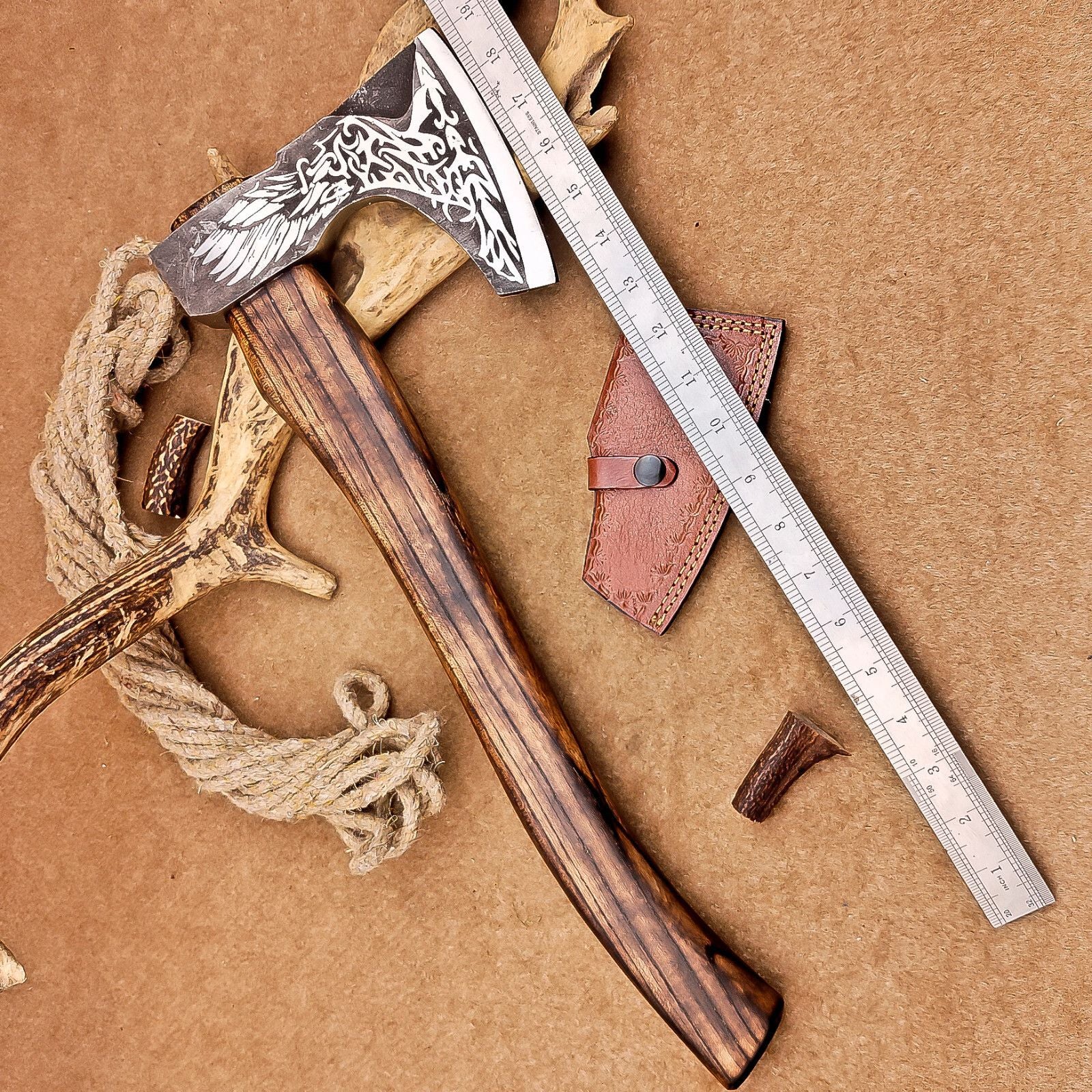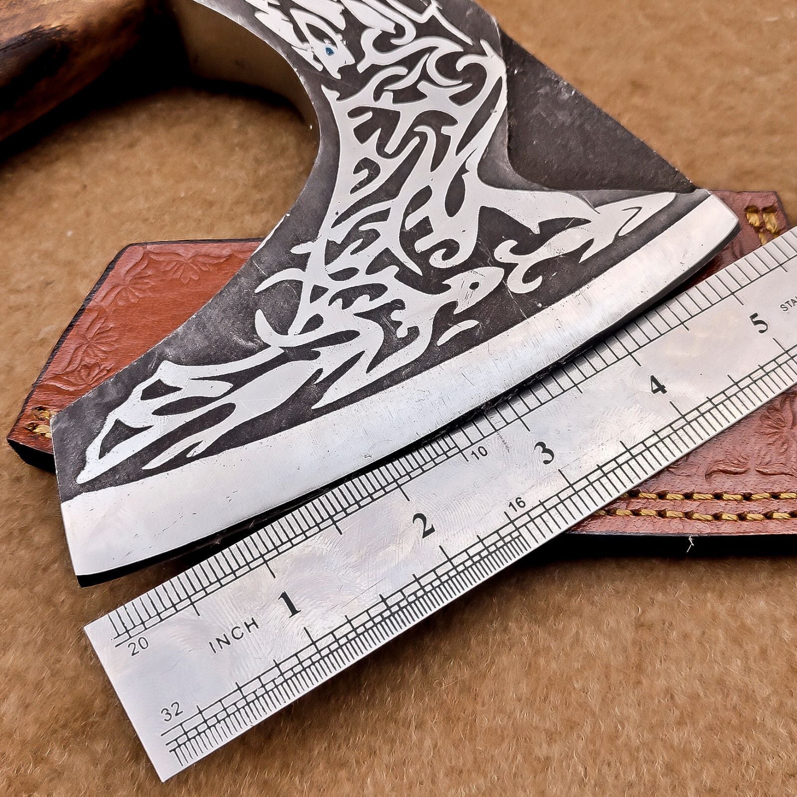 Experience the power and artistry of our Custom Hand-Forged Viking VALHALLA Axe, meticulously crafted from high-quality carbon steel for outstanding durability and cutting performance. This 18-inch tomahawk features a 5-inch cutting edge and is ideal for outdoor adventures, bushcraft, or as a striking addition to any Viking-inspired collection.