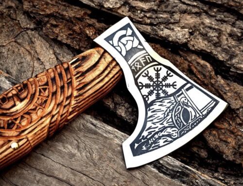 Custom Hand Forged Carbon Steel Viking Valhalla Throwing Axe with Engraved Wood Handle and Leather Sheath
