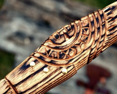 Measuring 20 inches in overall length, this Viking axe features a 5.75-inch blade length with a 4.75-inch cutting edge, perfectly balanced for both throwing and practical woodwork. The engraved wooden handle not only provides a secure grip but also adds a striking artistic touch, reflecting traditional Norse craftsmanship. Designed for both collectors and outdoor enthusiasts, this axe blends strength, history, and beauty into one functional piece.