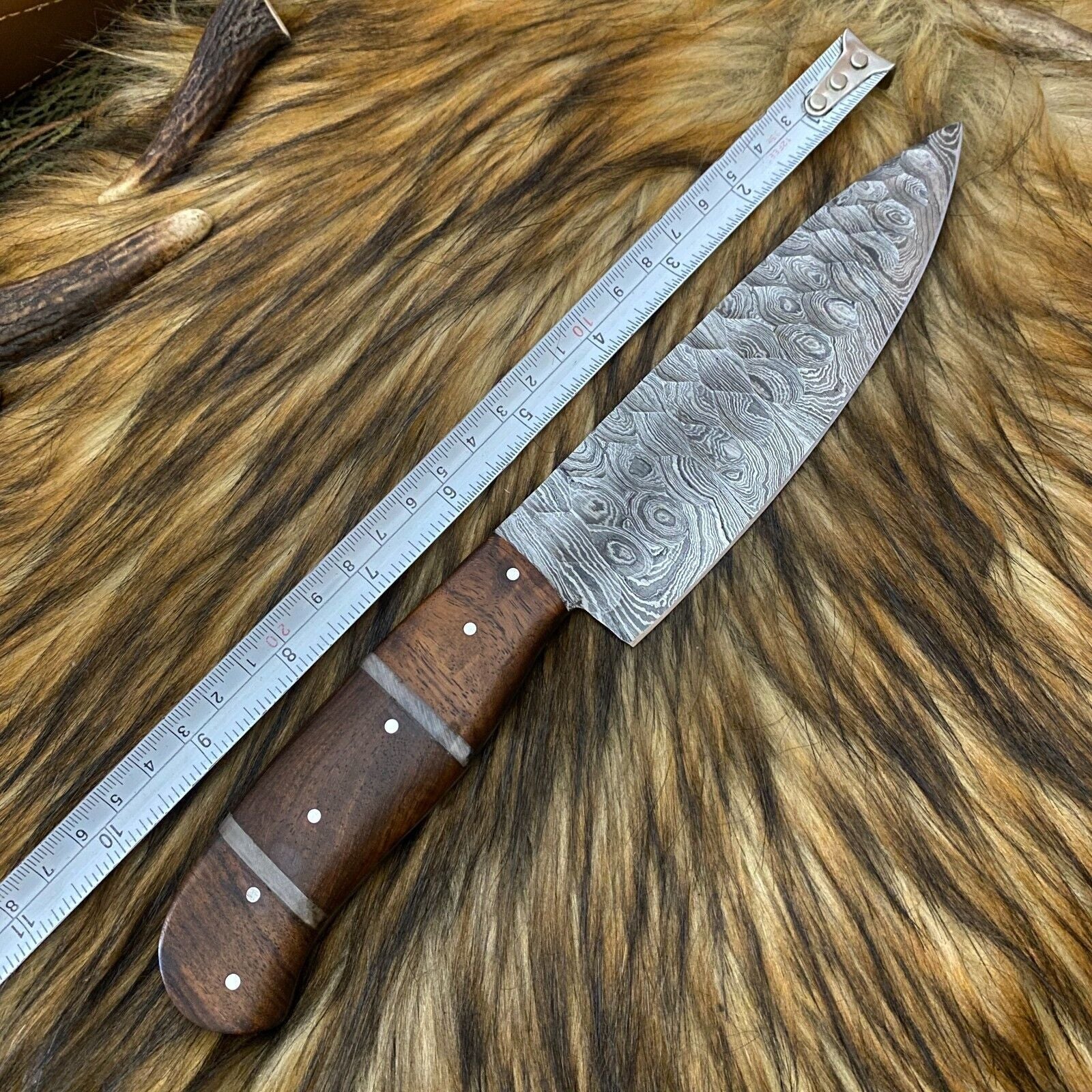 The Heritage Forge Custom Hand Forged Damascus Steel 4-Piece Chef Knife Set is designed for both professional chefs and passionate home cooks who value precision, durability, and artistry in their kitchen tools. Each knife in this set is meticulously handcrafted from premium Damascus steel, offering superior sharpness and long-lasting performance. The blades feature a hardness of 56-60 HRC, ensuring they maintain their edge even with regular use. With overall lengths ranging from 9 to 11 inches and blade lengths between 5 and 6 inches, each knife is perfectly balanced for comfort and control. The beautifully crafted wooden handles provide a secure and comfortable grip, while the unique Damascus patterns add a touch of elegance to your kitchen. This set comes complete with a high-quality leather sheath roll for safe storage and easy portability. Whether you are chopping, slicing, peeling, or preparing delicate cuts, this versatile set includes a chef’s knife, santoku knife, utility knife, and paring knife, making it the ultimate choice for elevating your cooking experience.