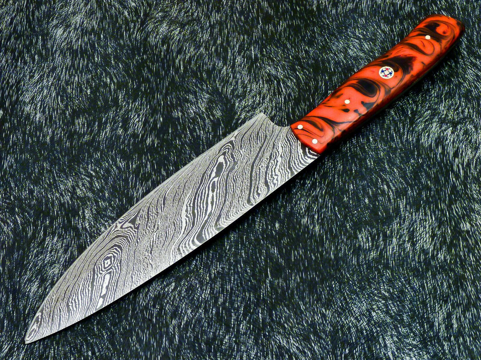 Add strength, beauty, and functionality to your kitchen with this custom hand forged 12-inch Damascus steel chef knife. Expertly crafted from 1095 high carbon steel and 15N20 nickel steel, the blade is folded into 512 layers to create a stunning twist pattern. The result is not only a breathtaking design but also a blade that holds a razor-sharp edge with 55–60 HRC hardness on the Rockwell scale.This chef knife features a 7-inch blade paired with a 5-inch resin sheet (Corian) handle, secured with brass and mosaic pins using strong epoxy for lifetime durability. The ergonomic handle ensures a comfortable grip, making it ideal for both professional chefs and home cooking enthusiasts. 4 mm thick spine, this knife is robust enough for heavy-duty cutting, yet balanced for precision tasks. Each knife is handmade, meaning slight variations in pattern may occur, making every piece truly unique.