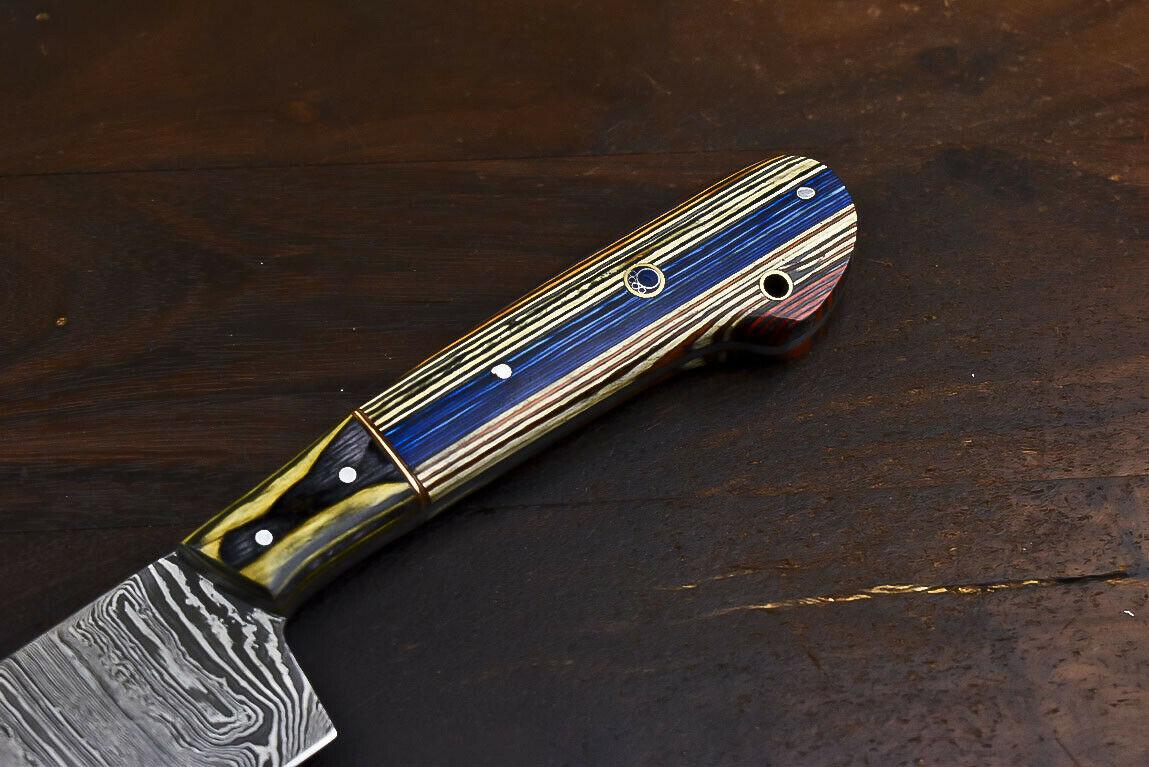 This custom hand-forged Damascus steel combat, hunting, and chef knife with hard wood handle is a unique blend of artistry, durability, and versatility. The knife shown in the photos is the exact item you will receive, ensuring authenticity. Featuring an 8.5-inch blade, a 5.5-inch hard wood handle, and an overall length of 14 inches, this knife is suitable for kitchen tasks, hunting, outdoor use, or as part of a knife collection. The blade is crafted from a premium mixture of 1095 and 15N20 steel, folded repeatedly to create a minimum of 288 layers, and then acid-burned to reveal multicolored Damascus patterns. Sharpened at 20 degrees and oil-tempered to 58-60 HRC, the knife provides excellent edge retention and precise cutting.The full tang construction, wooden bolster, and ergonomically finished handle ensure strength, balance, and long-lasting durability. Designed for both practical use and display, this knife combines functionality, artistry, and uniqueness. This handcrafted knife is ideal for chefs, hunters, collectors, and outdoor enthusiasts seeking a reliable and visually striking tool.