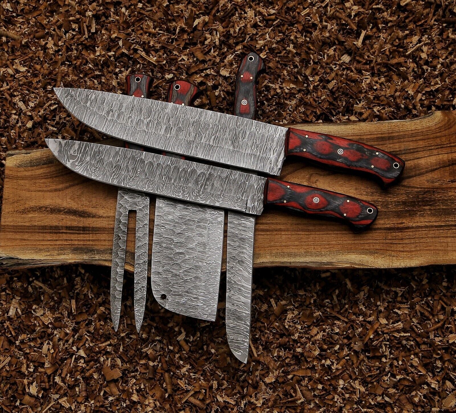 This Custom Hand Forged Damascus Steel Kitchen Chef Knife Set includes 5 expertly crafted knives, each designed for professional performance and aesthetic appeal. The blades are made from high-quality Damascus steel with a Rockwell hardness of 58-60 HRC, ensuring exceptional edge retention and durability. The handles are crafted from hard wood and feature acrylic accents with brass rivets and mosaic pins, offering both comfort and style. Each knife comes with a black genuine cowhide leather sheath for safe storage and transport. This set is perfect for chefs, cooking enthusiasts, or as a collectible kitchen tool. Please note, our knives are intended for responsible and legal use only and are not sold to individuals under 18. We recommend checking local regulations before purchasing, as some countries may have restrictions. For any questions, our team is ready to respond within 12 hours, and we strive to resolve any issues promptly to ensure complete satisfaction.