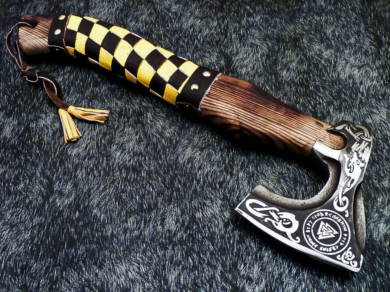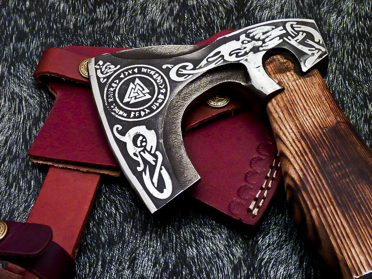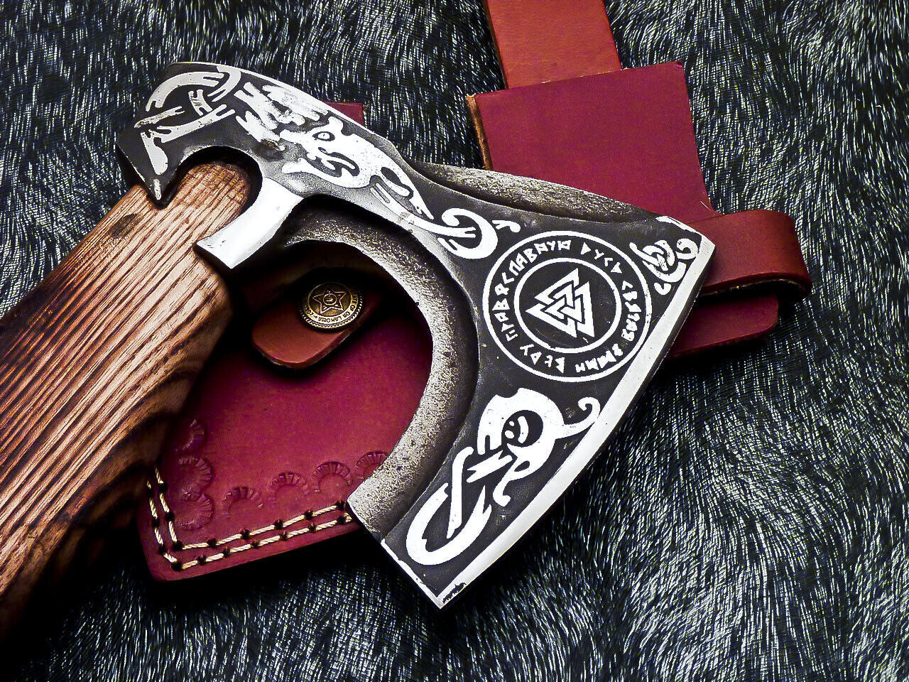 Experience the perfect blend of craftsmanship and functionality with this Custom Hand Forged Steel Viking Bearded Camping Axe. Featuring a robust 14.5-inch overall length and a 4-inch cutting blade, this axe is forged from premium high carbon steel, hand-tempered to a hardness of 58-60 HRC, ensuring exceptional durability and a razor-sharp edge. The axe head showcases intricate hand-etched carving designs, making each piece unique and visually striking, while the natural wood handle provides a secure and comfortable grip for outdoor tasks. This fully functional axe is ideal for camping, hunting, and other outdoor adventures, yet it is crafted with such attention to detail that it also makes a remarkable collectible or gift for enthusiasts of Viking weaponry. Every axe comes with a high-quality, hand-stitched leather sheath for safe storage and transport. While the design may slightly vary due to the handmade process, every axe retains the same superior materials and craftsmanship. Perfect as a birthday, anniversary, or special gift for anyone who appreciates fine Viking-inspired tools, this axe is both practical and a work of art.