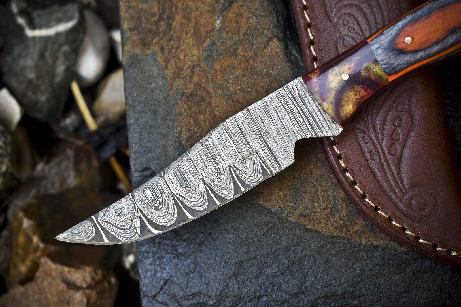 Whether you're skinning game, bushcrafting, or simply collecting, this damascus skinner hunting knife offers premium craftsmanship and lasting performance. Comes with a hand-tooled leather sheath for secure carry and protection.