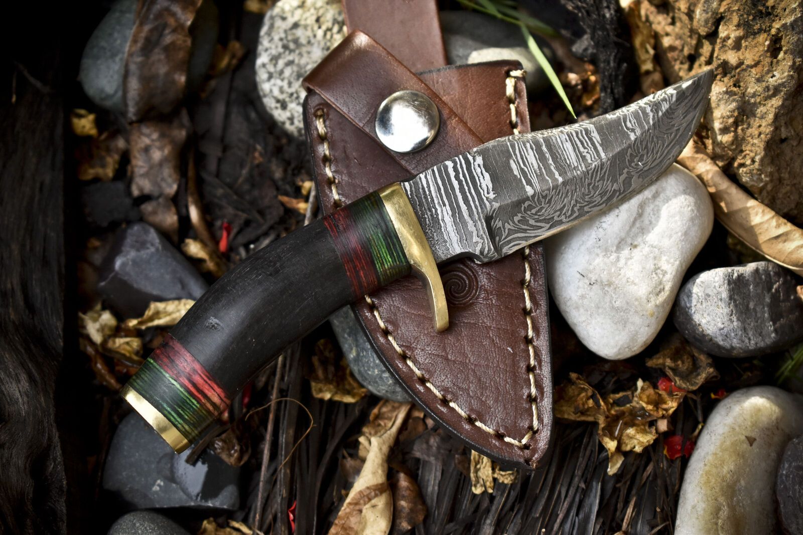 This custom hand forged skinner knife is expertly crafted from premium twist Damascus steel, offering both beauty and performance for hunting, camping, and outdoor adventures. Measuring approximately 6 inches overall with a 3-inch blade and 3-inch handle, it features a razor-sharp edge ideal for skinning game. The Damascus steel is forged from 1095 and 15N20 high carbon steels, folded multiple times to create a striking twist pattern with deep blacks and bright silvers. This process not only delivers a captivating look but also ensures superior hardness and durability. The handle is made from genuine ram’s horn, providing a comfortable, non-slip grip and a naturally unique pattern. A polished brass guard adds elegance and extra hand protection. Included is a high-quality, hand-tooled leather sheath, designed for durability and long-term use in rugged conditions. This knife is entirely handmade, ensuring each piece is one-of-a-kind. Ideal for hunters, collectors, and outdoor enthusiasts, this skinner knife is both a functional tool and a work of art.
