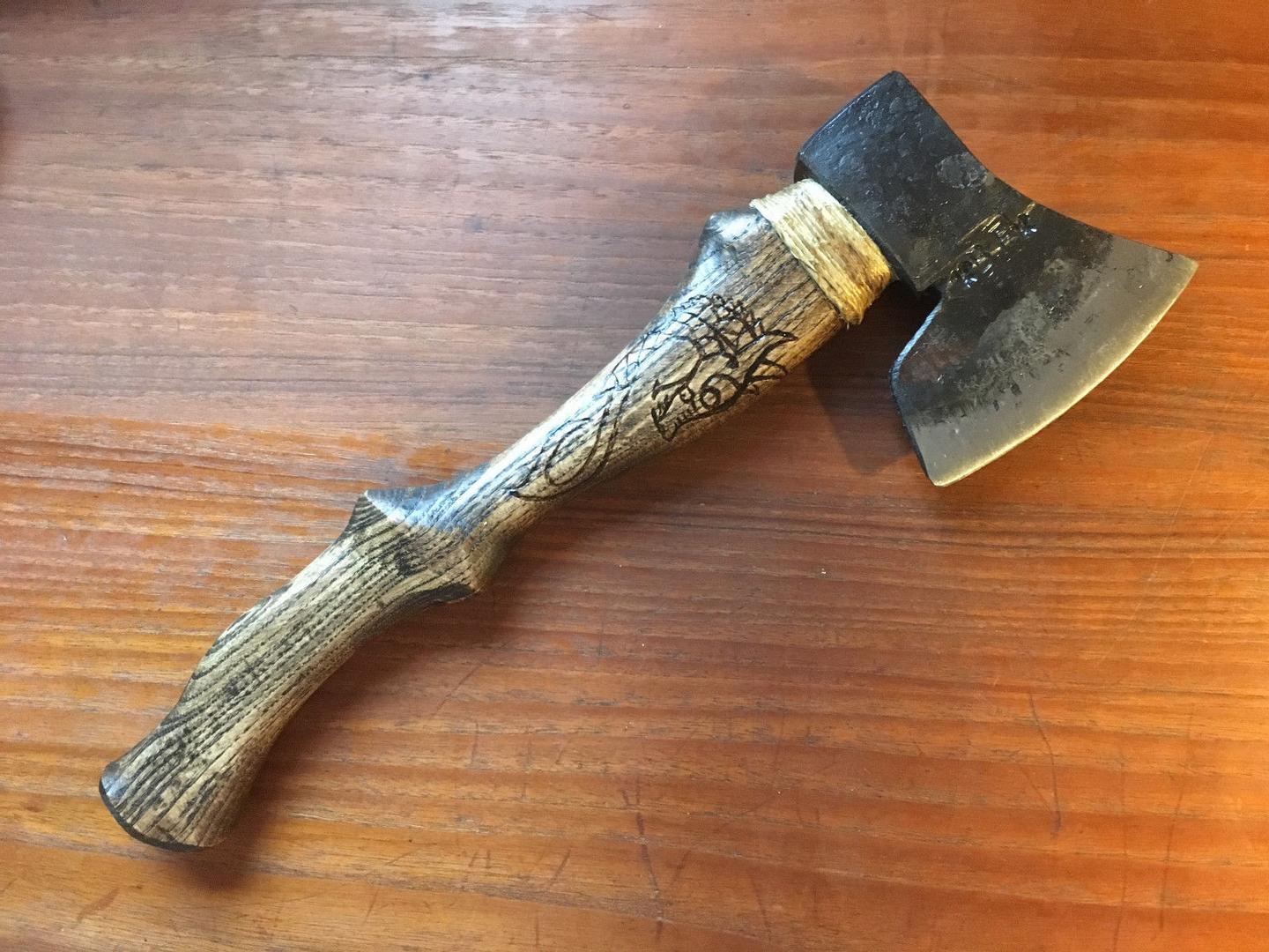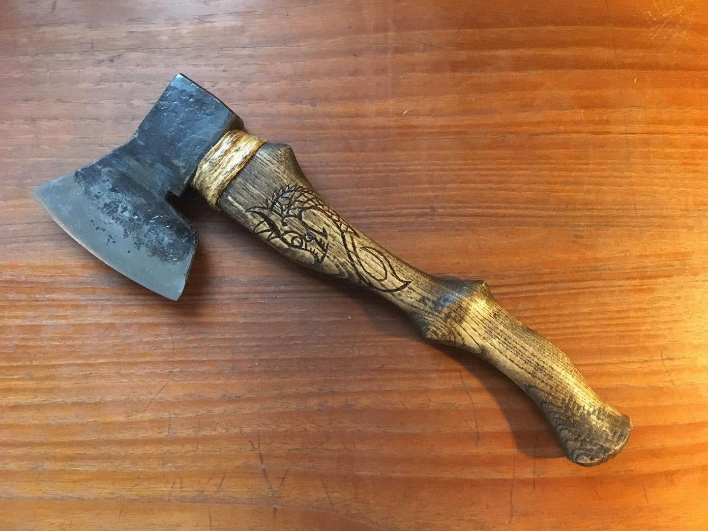 Custom Hand-Forged Viking Battle Axe | Hatchet with Hand-Carved Hickory Handle