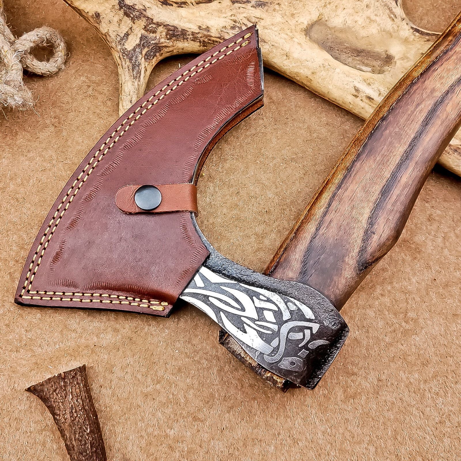 This Viking Valhalla axe is a finely hand forged carbon steel weapon, combining traditional craftsmanship with modern durability. Measuring 18 inches in overall length and featuring a 5-inch cutting edge, it provides both functional performance and historical authenticity. The natural wood handle ensures a firm and comfortable grip, reflecting the design of traditional Norse axes. Each blade is intricately hand engraved, showcasing a unique artistic style that enhances its display value and historical appeal. This throwing and combat axe comes with a premium hand-stitched leather sheath, offering secure storage and easy transport. Perfect for collectors, reenactors, or enthusiasts of Viking battle axes, it embodies the spirit of Norse warriors and their legendary craftsmanship. The robust carbon steel blade guarantees durability, while careful attention to handle ergonomics ensures ease of use during demonstrations or practice. Whether displayed as a centerpiece or used in reenactments, this replica Viking axe delivers both aesthetic and functional excellence. Its combination of strength, artistry, and authenticity makes it an exceptional addition to any collection or a striking gift for fans of Viking weaponry.