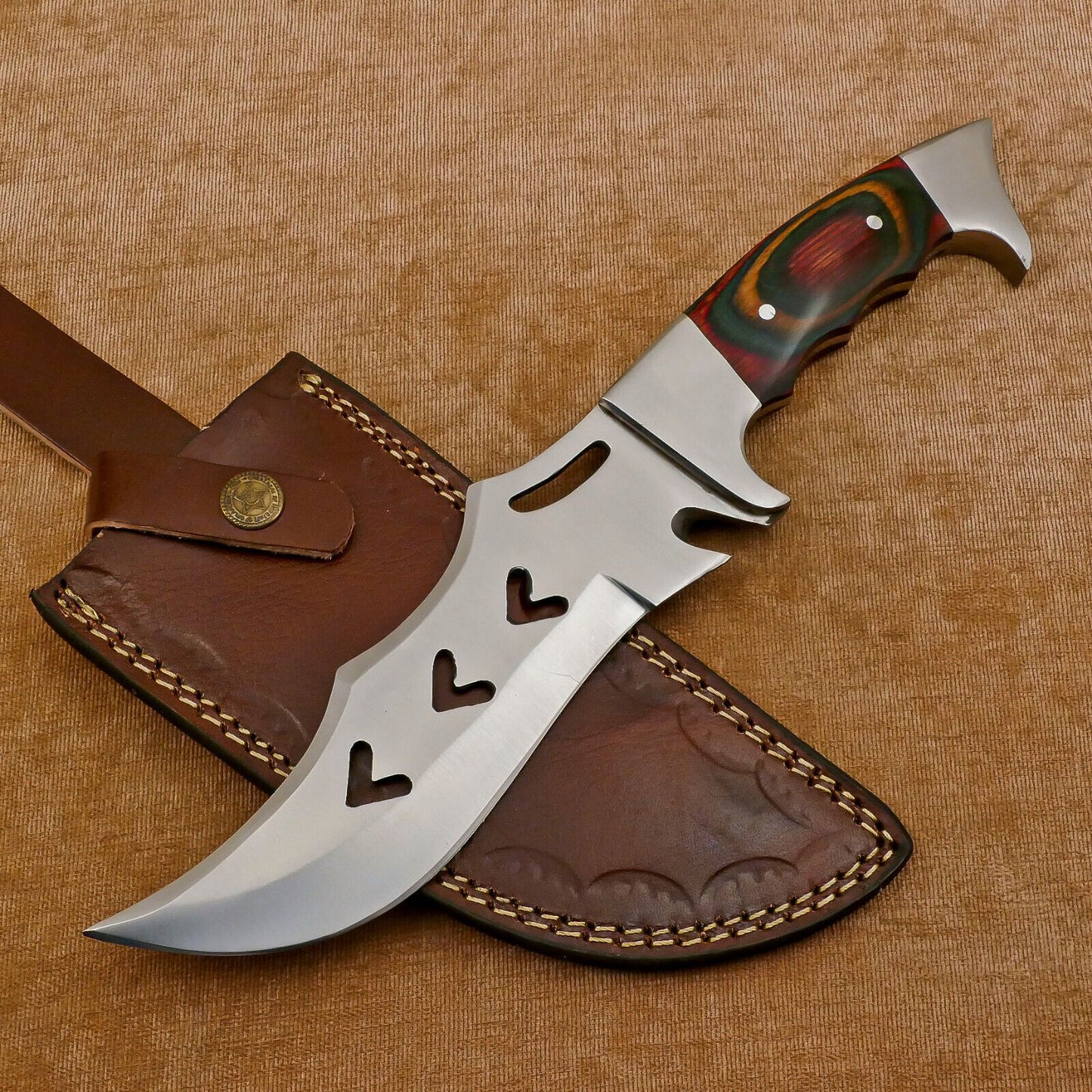 This handmade D2 clip point full tang Bowie hunting knife is a rugged 12-inch outdoor tool designed to perform in the most demanding conditions. Forged from premium D2 tool steel, the blade is exceptionally sharp, corrosion-resistant, and built for long-lasting edge retention. The clip point profile provides excellent piercing strength and fine control, making it ideal for hunting, skinning, cutting, or survival use in the wilderness.The full tang construction ensures maximum strength and balance, giving you confidence in handling even the toughest outdoor challenges. The handle is ergonomically shaped to provide a secure, comfortable grip, reducing fatigue during extended use. Accompanied by a handcrafted leather sheath, this Bowie knife is both safe to carry and quick to access when needed.