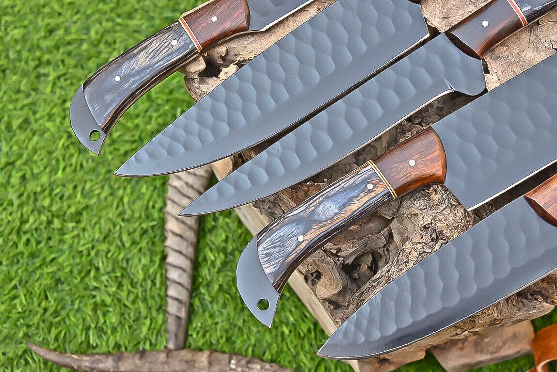 This Custom Handmade Carbon Steel Kitchen Chef Set is a perfect blend of style, functionality, and durability. Each knife in the set features a black wood handle, offering a comfortable grip and elegant appearance. With overall lengths ranging from 10 to 11 inches and cutting blades between 6 to 8 inches, these knives are designed for precision and versatility. Crafted from high-quality carbon steel with a hardness of 55-58 HRC, they maintain sharpness even after heavy use. Ideal for professional chefs, home cooking, hunting, camping, skinning, fishing, and outdoor survival, this chef set guarantees excellent edge retention and long-lasting performance. Every knife is 100% original and handcrafted with care, ensuring a unique piece that combines beauty with practicality.