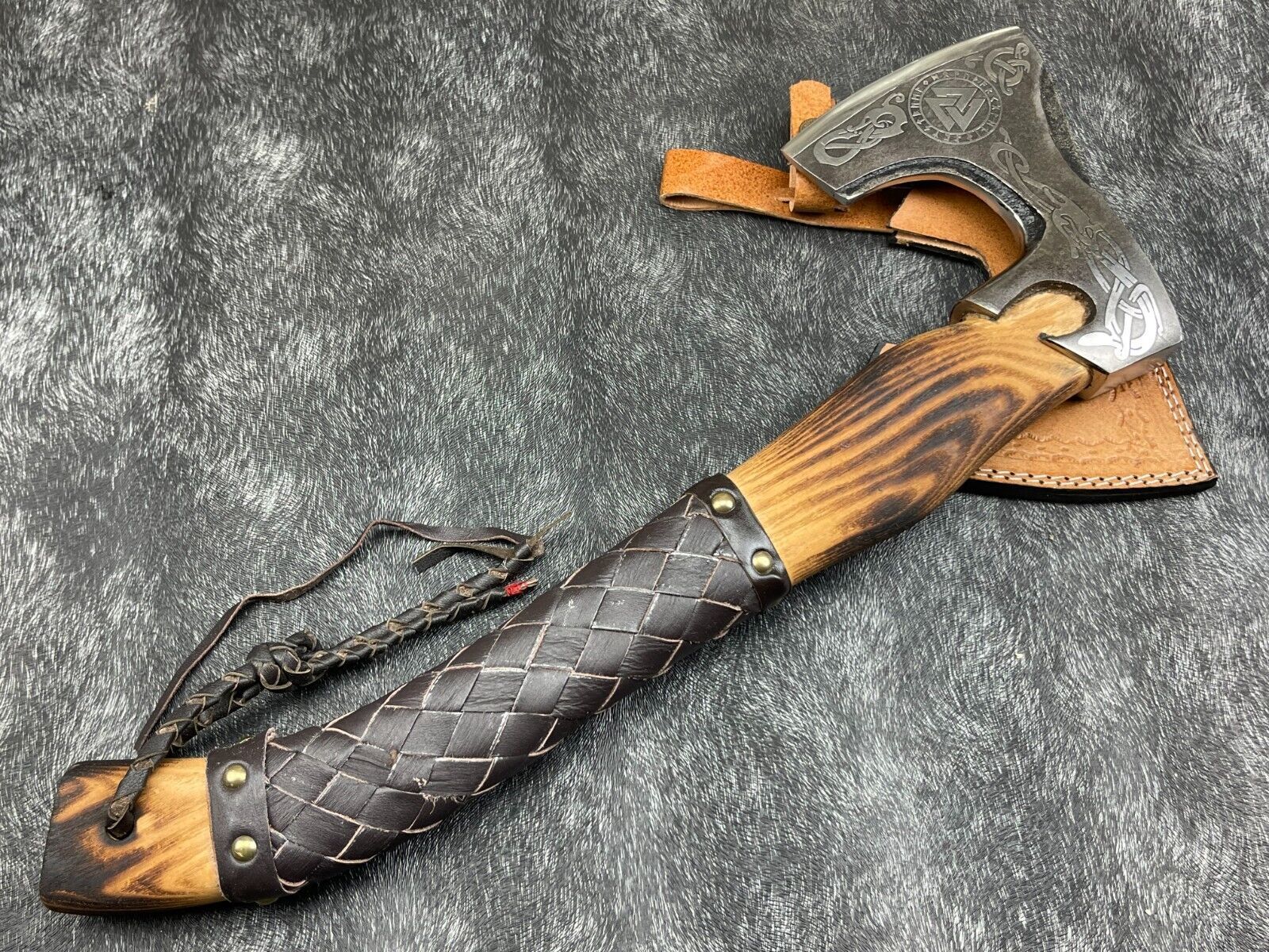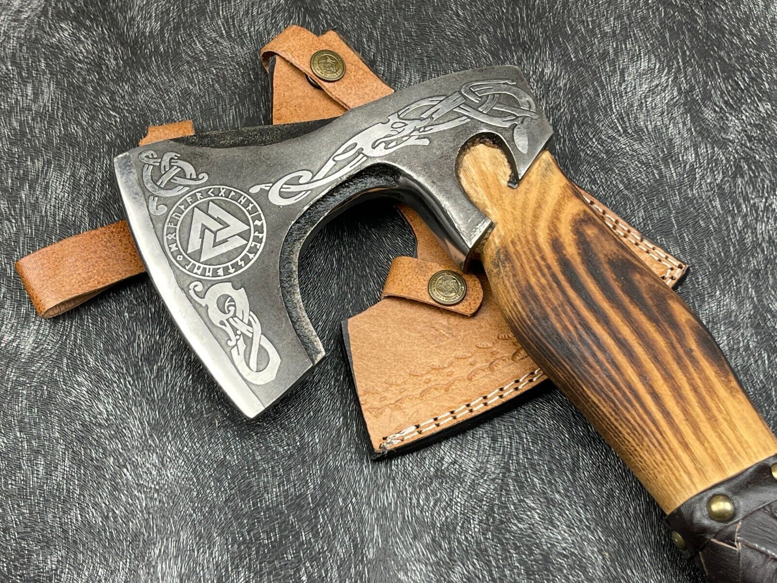 Experience the perfect combination of craftsmanship and functionality with this Custom Handmade Carbon Steel Viking Axe. Each axe is individually hand-forged using over 270 layers of 1095 and 15N20 high carbon tool steels, creating a strong, durable, and visually striking blade with a nickel layer for added contrast. The blade has been heat treated to 56-57 HRC for lasting sharpness and reliability. The total axe length measures approximately 17.5 inches, with a 4.5-inch blade, a 6.5-inch head width, and an 11-inch natural wood handle. The handle features intricate hand-etched designs and leather wrapping for both aesthetics and a secure grip. This axe comes with a high-quality thick leather sheath for safe storage and transport. Perfect as a gift for fathers, groomsmen, or Christmas, this handmade bearded axe is not only a functional tool for camping, chopping, and outdoor activities, but also a remarkable piece of Nordic artistry. Each axe is unique, showcasing individual handcrafted details and exquisite metalwork, making it a collectible and practical addition to any enthusiast’s collection.