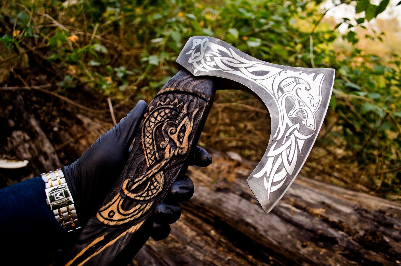 This custom handmade Viking axe is a remarkable blend of craftsmanship and functionality, designed for axe throwing, camping, woodcutting, or display as a collector’s piece. Forged from premium high carbon steel with a hardness of 58–60 HRC, the blade ensures long-lasting sharpness, strength, and durability. The axe measures approximately 23.5 inches in overall length, with a 7-inch cutting edge and a 7-inch axe head, making it a powerful yet balanced tool for practical outdoor use. The handle is crafted from solid engraved ash wood, combining durability with a unique, rustic aesthetic that pays homage to traditional Viking tomahawk designs. Each axe comes with a robust hand-tooled leather sheath, sewn with reinforced stitching for maximum durability and safe storage. This sheath protects the sharp blade while ensuring easy portability. Perfect as a throwing axe, bearded Viking hatchet, or as a unique birthday gift for him, this axe embodies both strength and artistry. Whether you’re a camper, outdoorsman, reenactor, or collector, this hand forged carbon steel axe with its engraved wooden handle is built to perform and impress.