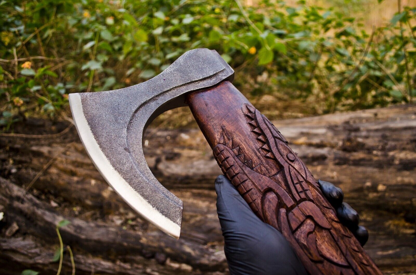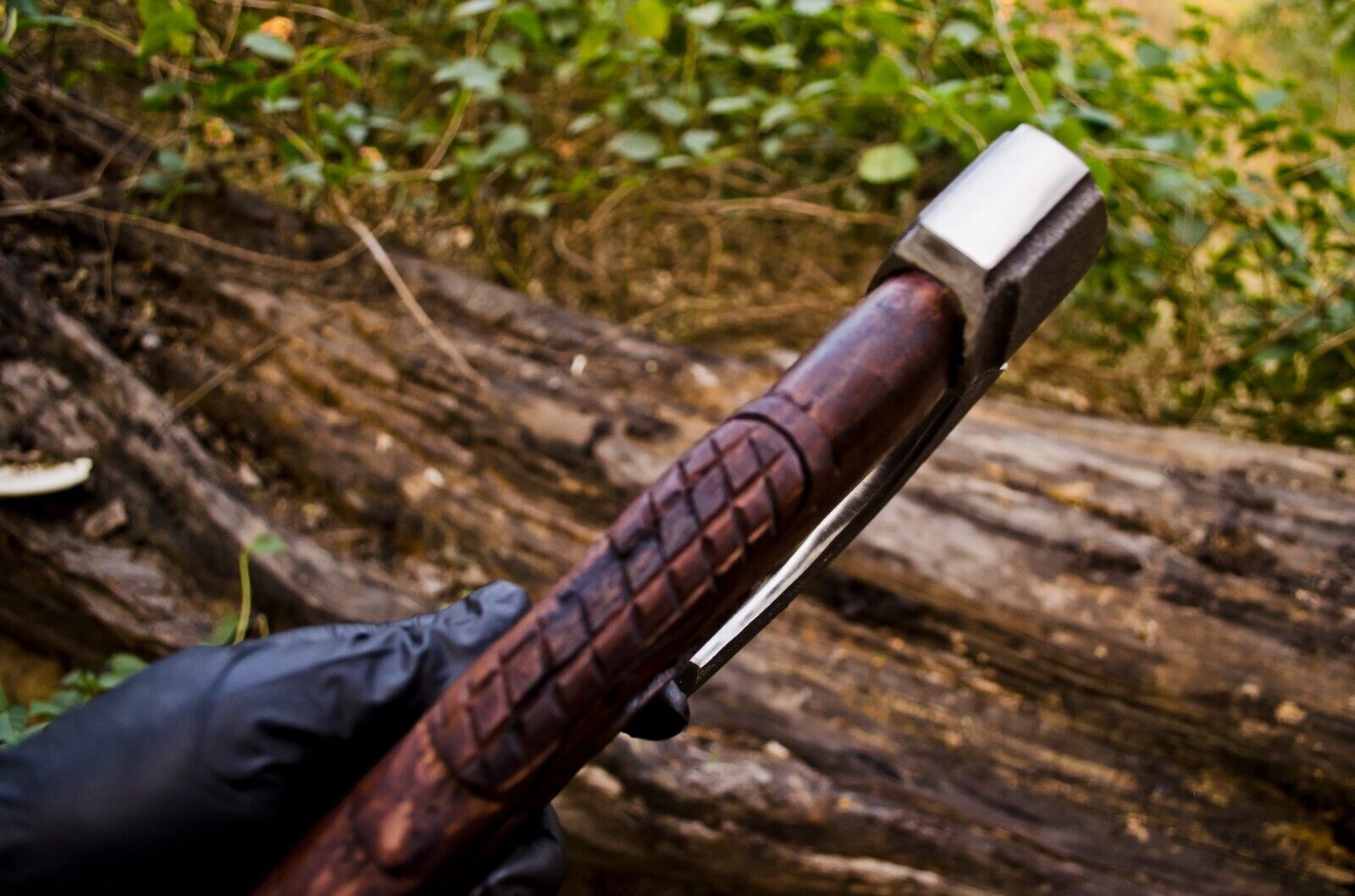 This custom handmade Viking axe is forged with precision from high-quality carbon steel, making it an ideal choice for collectors, outdoorsmen, and axe throwing enthusiasts. Designed with both functionality and artistry in mind, the axe features a strong, durable blade that measures approximately 7.25 inches across the cutting edge with a 6.75-inch head. The overall length of the axe is about 22 inches, offering the perfect balance for chopping, throwing, or camping use.