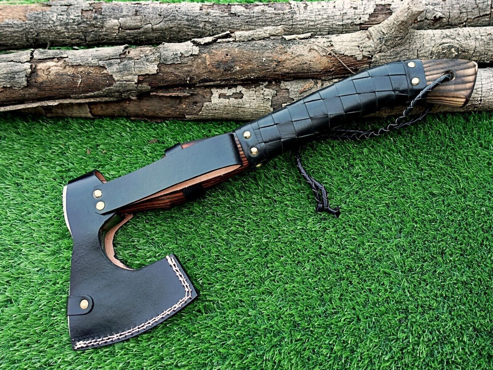 Custom Handmade Carbon Steel Viking Bearded Axe with Rose Wood Handle and Leather Sheath