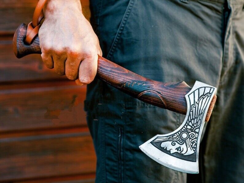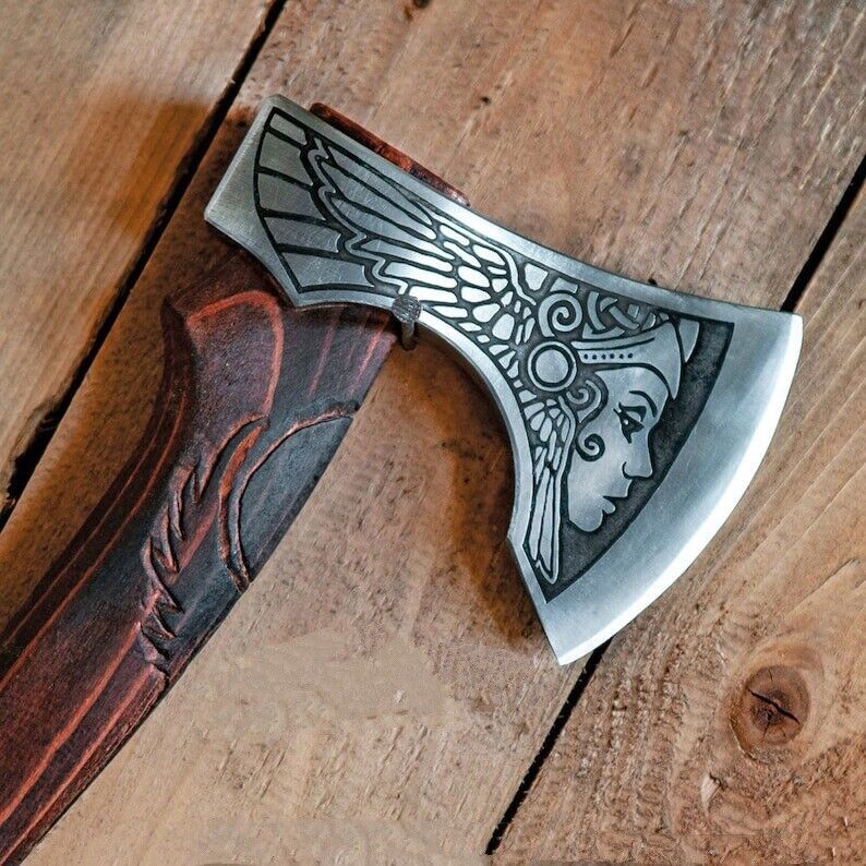 This Freya Axe is a custom handmade Viking hatchet and tomahawk, meticulously hand-forged from high carbon steel to ensure exceptional durability and sharpness. The overall length of the axe is 18.5 inches, with a head width of 6 inches and a cutting blade length of 6 inches, making it ideal for hunting, bushcraft, and outdoor adventures. The hand-engraved axe head adds a touch of artistry, showcasing traditional Viking craftsmanship. The solid wood handle provides a comfortable and secure grip, while the included hand-stitched leather sheath protects the blade during storage and transport. With a hardness rating of 55-58 HRC, this axe maintains a razor-sharp edge for precision cutting. Each axe is a unique piece of functional art, perfect as a collectible or a gift for enthusiasts of Viking tools and outdoor equipment. Care instructions include keeping the blade dry after each use and storing it safely away from children.