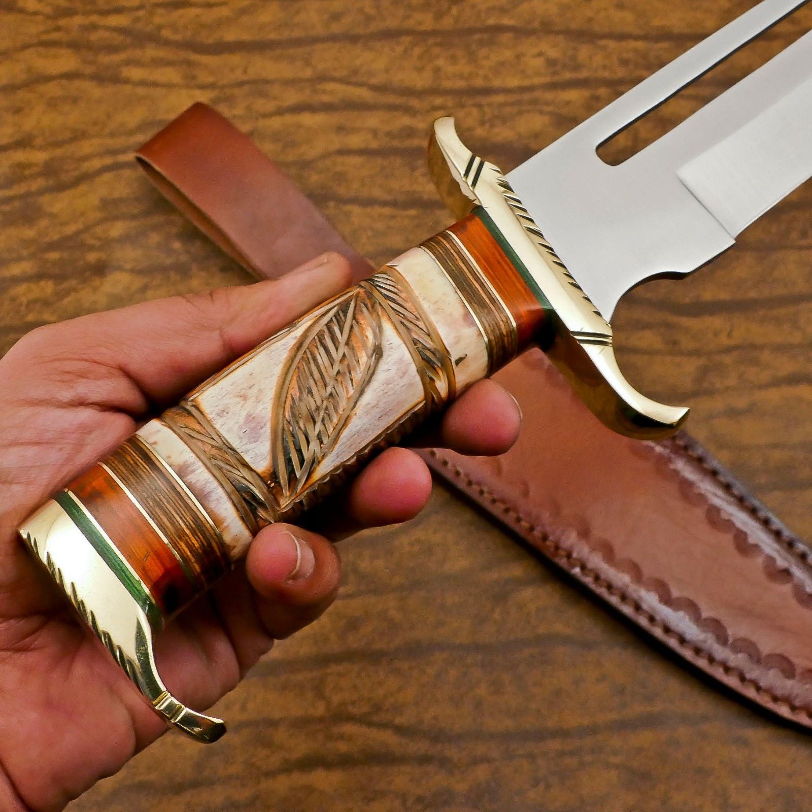 Take your outdoor adventures to the next level with this custom handmade D2 steel Bowie hunting and outdoor knife. Crafted with a 13-inch full tang blade forged from premium D2 tool steel, this knife offers exceptional sharpness, edge retention, and durability, making it ideal for hunting, camping, survival, and general outdoor tasks. The full tang construction ensures superior strength and balance, providing precise control for chopping, skinning, and other demanding activities. Its ergonomic handle delivers a secure, comfortable grip, while a sturdy steel guard enhances safety during rigorous use. Each knife is meticulously handcrafted, giving it a unique character and artisanal quality that distinguishes it from mass-produced blades. Rugged yet refined, this Bowie knife is perfect for hunters, campers, survivalists, and collectors who appreciate both functionality and style. Its sharp edge and solid construction make it a reliable companion in the wild, while its handcrafted design ensures it stands out as a collectible piece. Combining performance, durability, and handcrafted artistry, this D2 steel Bowie hunting and outdoor knife is the ultimate tool for outdoor enthusiasts seeking a high-quality, dependable blade.