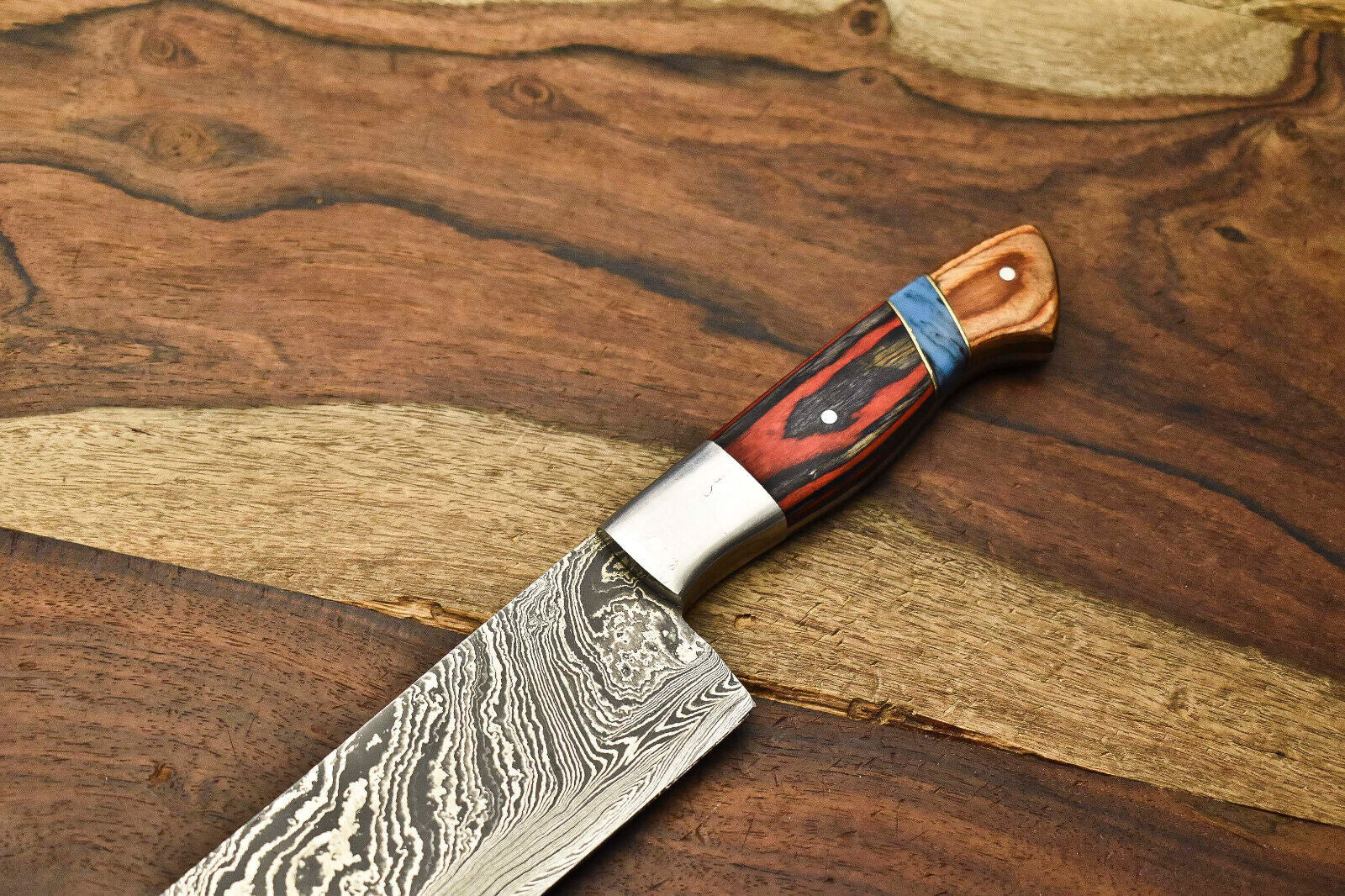 This custom handmade chef knife is expertly crafted from genuine Damascus steel, featuring a full tang chopper design for exceptional strength, balance, and precision. Our Damascus is 100% real—crafted from a blend of 1095 high carbon steel and 15N20 nickel carbon, folded over and over to create 384 unique layers. The blade is then acid-etched, revealing the striking contrast between the satin nickel and deep gray high carbon layers. The high-polished handle offers a comfortable and secure grip, while the sharpened edge ensures top-tier cutting performance. Ideal for professional chefs, home cooks, and collectors alike, this chopper knife is both a high-performance tool and a work of art. Each knife is completely handmade for unmatched quality and uniqueness.