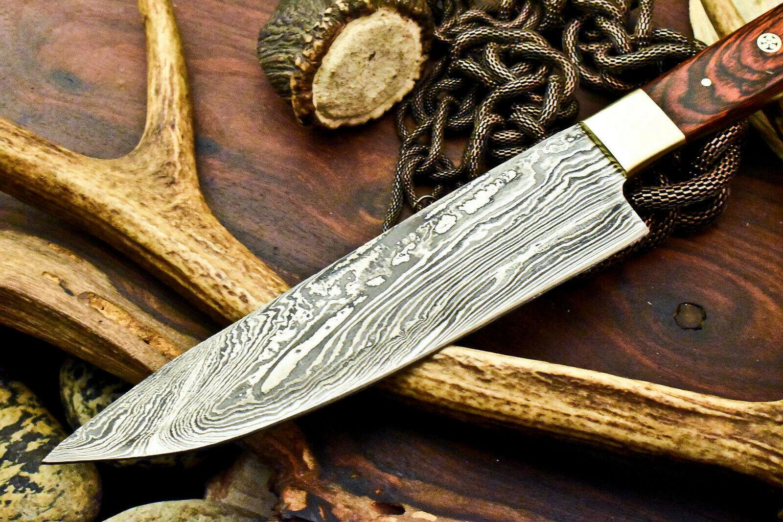 This custom handmade Damascus chef hunting knife is designed with precision, strength, and timeless craftsmanship. Forged from a combination of 1095 high carbon steel and 15N20 nickel steel, the blade features 384 layers that produce a striking and unique Damascus pattern. Each knife undergoes acid etching to reveal the intricate layers, making every piece one-of-a-kind. The blade is expertly sharpened and polished to deliver exceptional edge retention and durability, ideal for both hunting and kitchen use. Its ergonomic hardwood handle provides excellent grip, comfort, and balance, allowing for precise control whether you are preparing food or using it outdoors. Every knife is 100% handmade, without CNC machining, ensuring authenticity and artisanal quality. Built for performance and crafted for collectors, this Damascus steel chef hunting knife is a true masterpiece that blends beauty with functionality.