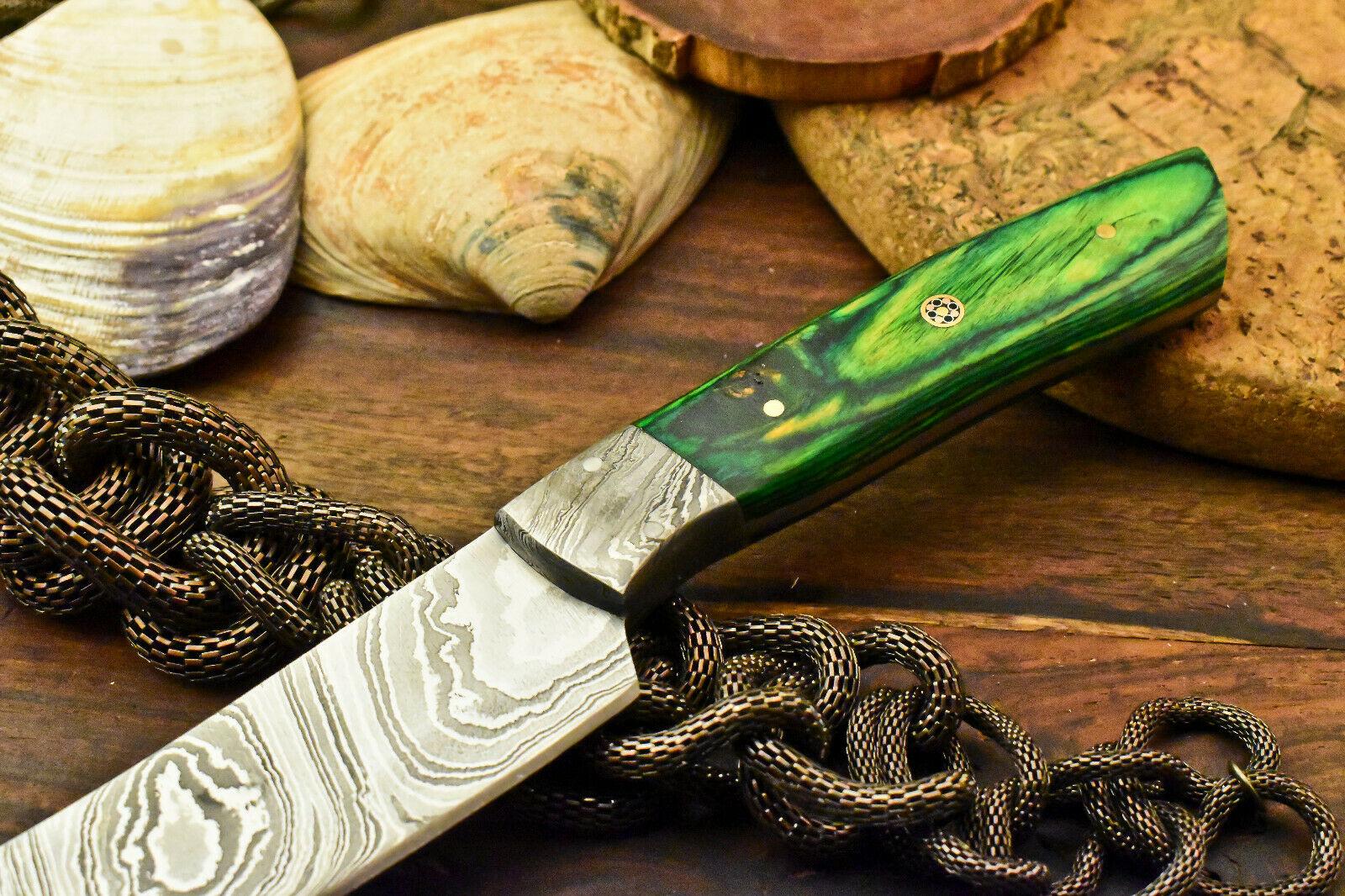 This custom handmade Damascus chef hunting knife with hard wood handle is a masterpiece of craftsmanship and durability. Each knife is 100% handmade, ensuring a unique and authentic piece. The blade is forged from a premium mixture of 1095HC and 15N20 nickel carbon steel, folded multiple times to create 384 layers, then acid-burned to reveal the striking Damascus pattern—nickel turns satin while high carbon steel turns blackish gray. The handle is high-polished hard wood, and the blade edge is sharpened to perfection, providing precision cutting with excellent edge retention.Every knife is crafted with meticulous care, combining full tang construction with aesthetic appeal, making it ideal for both kitchen and hunting use or as a collectible piece. The acid etching and high polishing process ensures that the layers of Damascus steel are beautifully visible, showcasing both artistry and functionality. This knife represents the pinnacle of hand-forged Damascus craftsmanship, blending strength, durability, and elegant design.