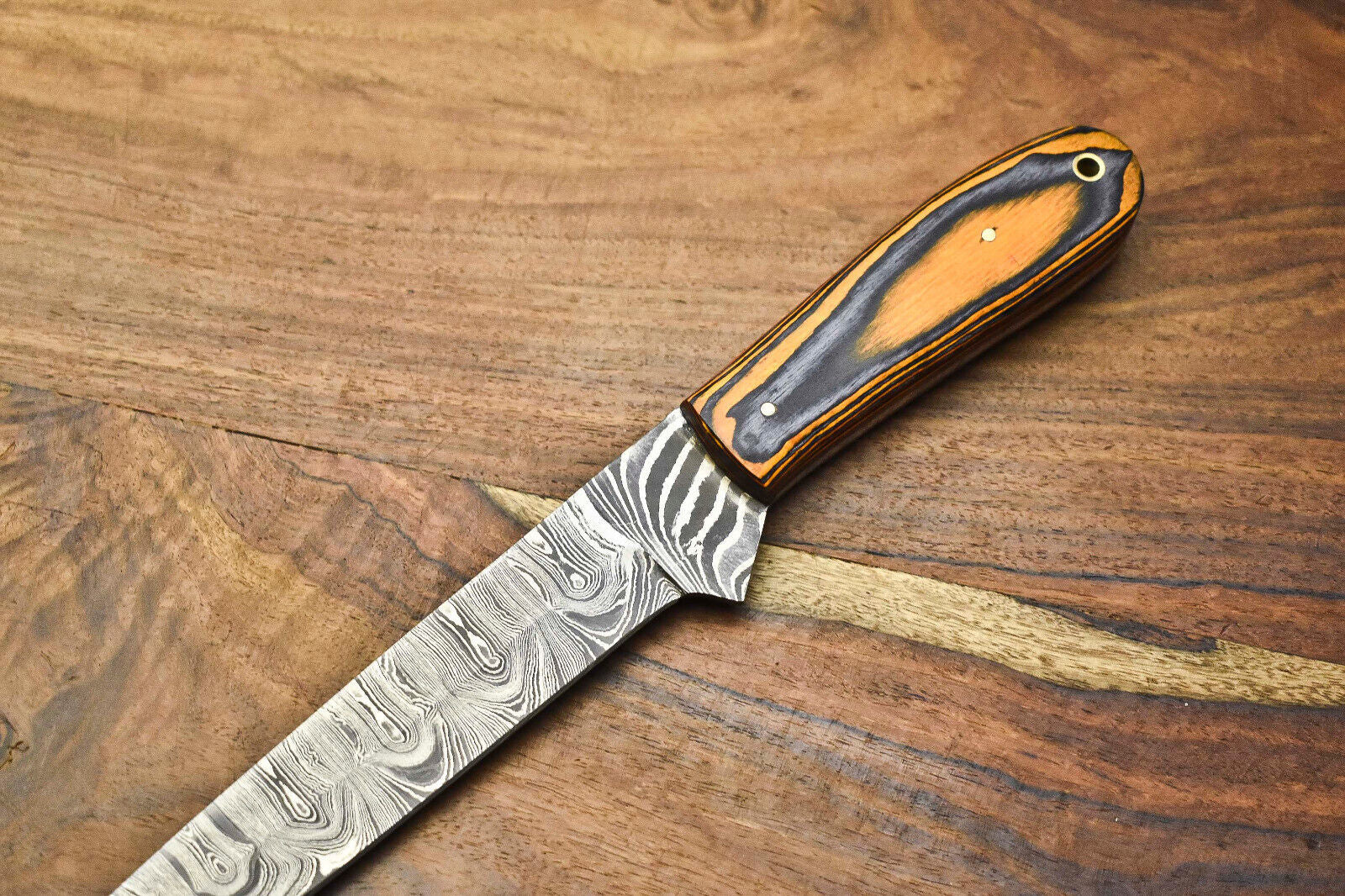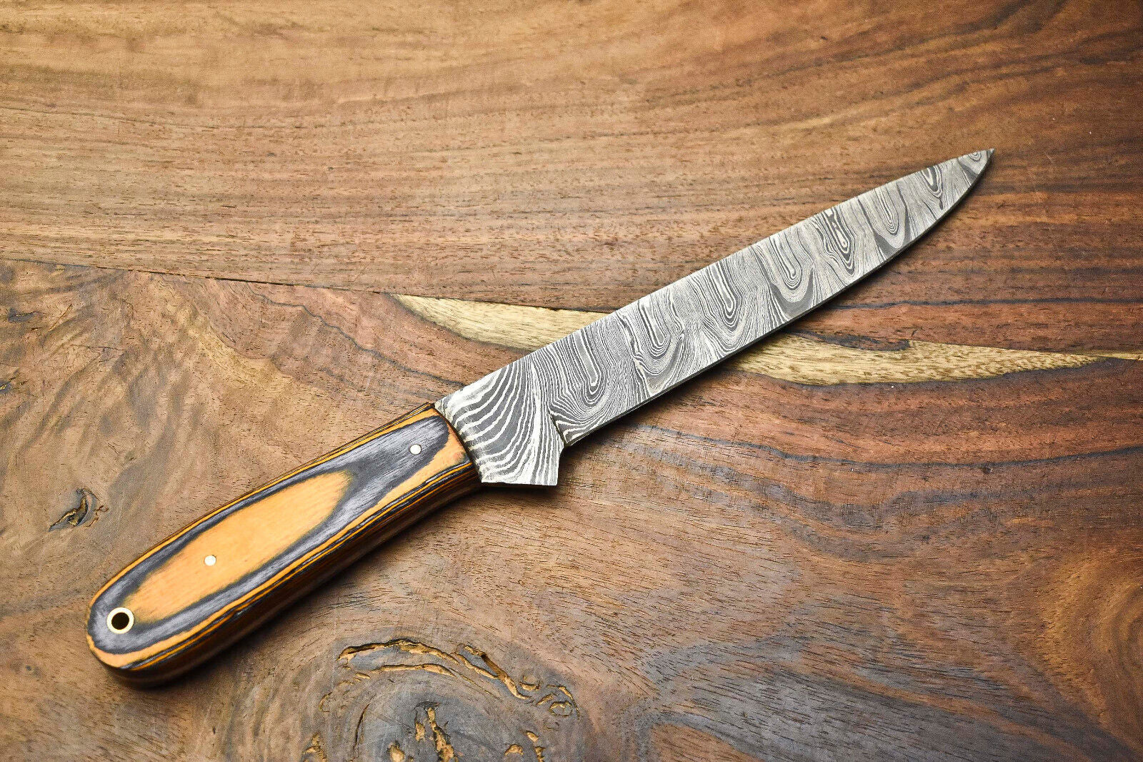 Discover the craftsmanship behind this custom handmade Damascus steel blade chef knife, designed for both kitchen use and sport utility. This full tang knife is forged from genuine Damascus steel made by layering 1095 high carbon steel and 15N20 nickel steel. The billet is folded multiple times to create a stunning 384-layer pattern that’s not only visually striking but also delivers exceptional strength and durability. The blade is then acid-etched to reveal the elegant wave-like pattern unique to real Damascus. After forging, the knife is meticulously polished and sharpened, resulting in a satin-finish edge that holds sharpness exceptionally well. The polished handle ensures a comfortable grip, making it both a functional and beautiful tool for chefs, collectors, and outdoor enthusiasts alike.