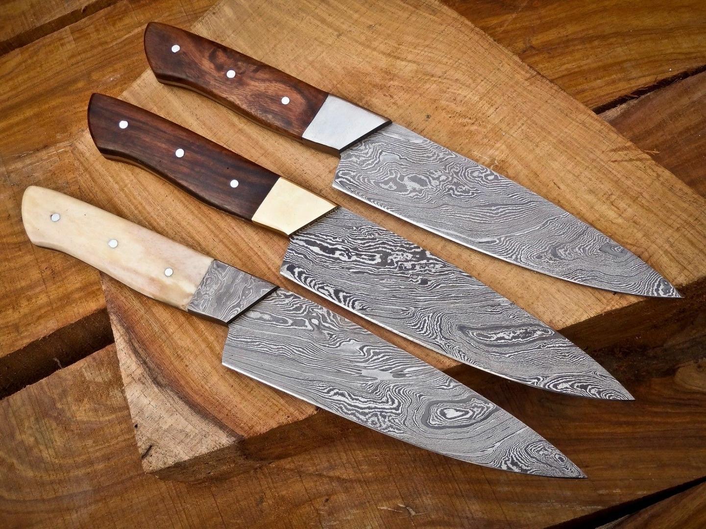 Custom Handmade Damascus Chef Knife Set 3pcs – Rosewood & Camel Bone Handle