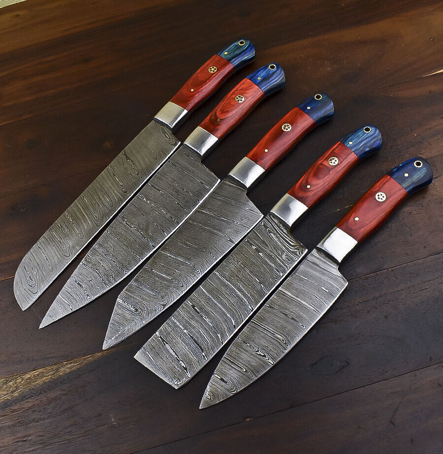 Custom Handmade Damascus Chef Knife Set of 5 | Hardwood Handle, Steel Bolster, Full Tang Survival Bushcraft Knives