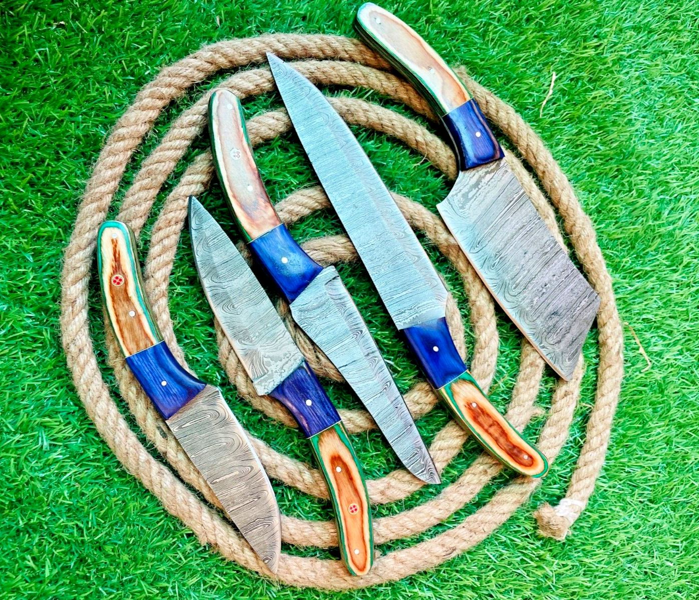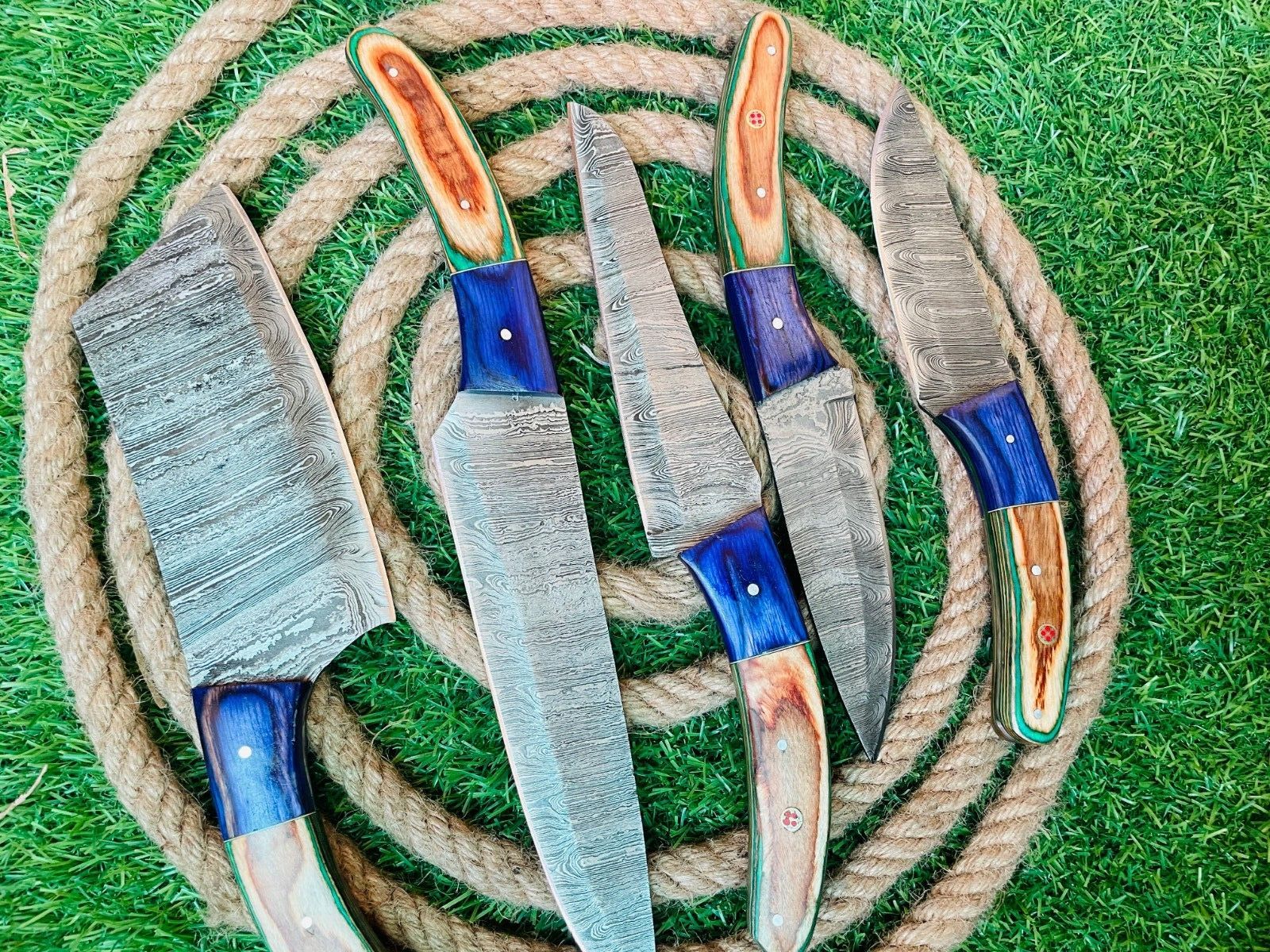 Custom Handmade Damascus Steel 5 Knives Cutlery Chef Knife Set with Bag for Kitchen