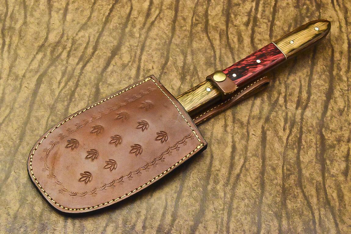 This custom handmade Damascus steel axe is a remarkable blend of craftsmanship, durability, and functionality, perfect for collectors and outdoor enthusiasts. Measuring 16 inches overall, with an 11-inch hardwood handle and 5-inch blade, this full tang Damascus tomahawk hatchet knife is built for performance and longevity. The blade is expertly forged from 1095 and 15N20 steels, folded five times to create approximately 288 layers, forming an intricate Damascus pattern that flows all the way to the edge.