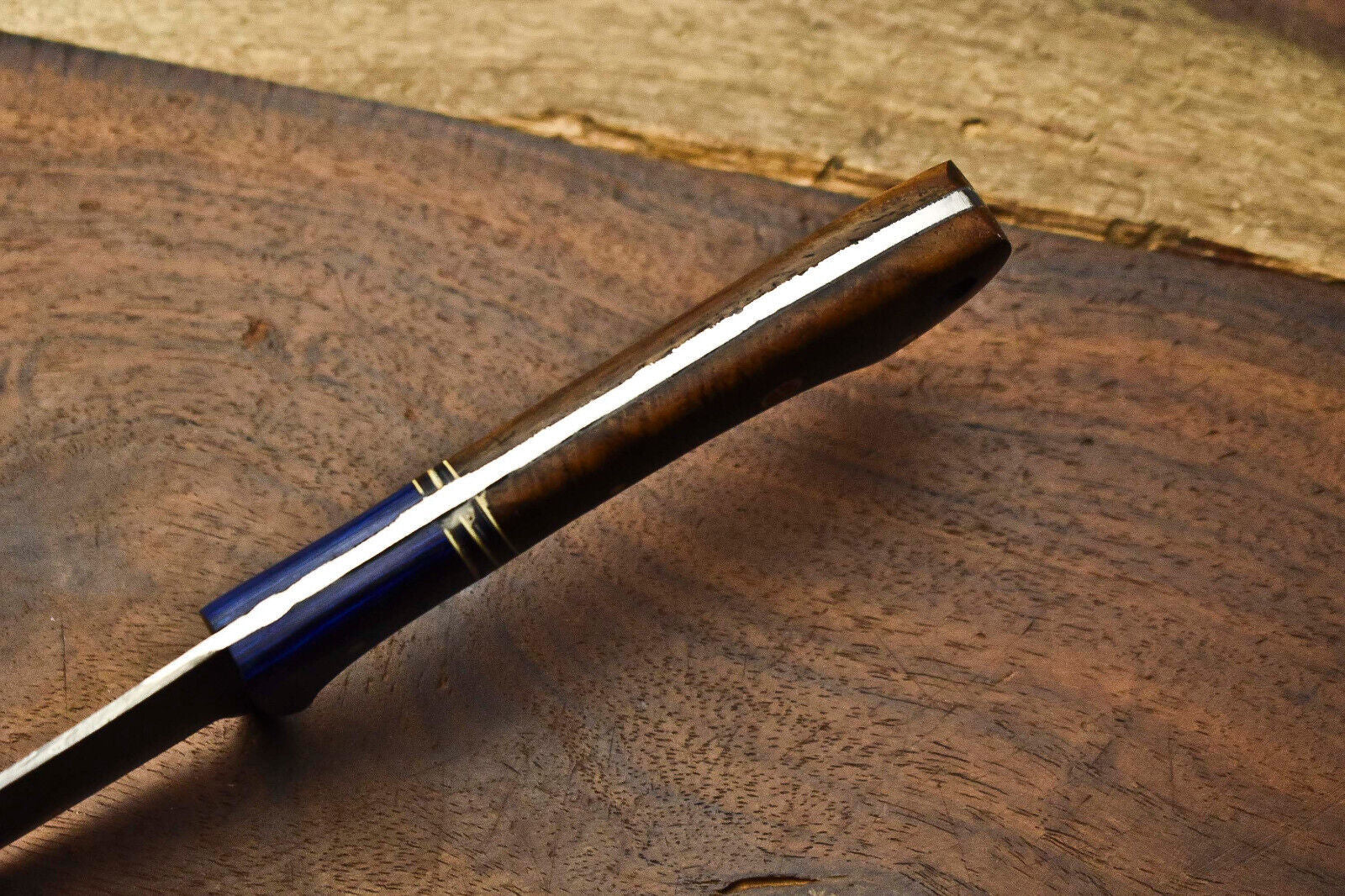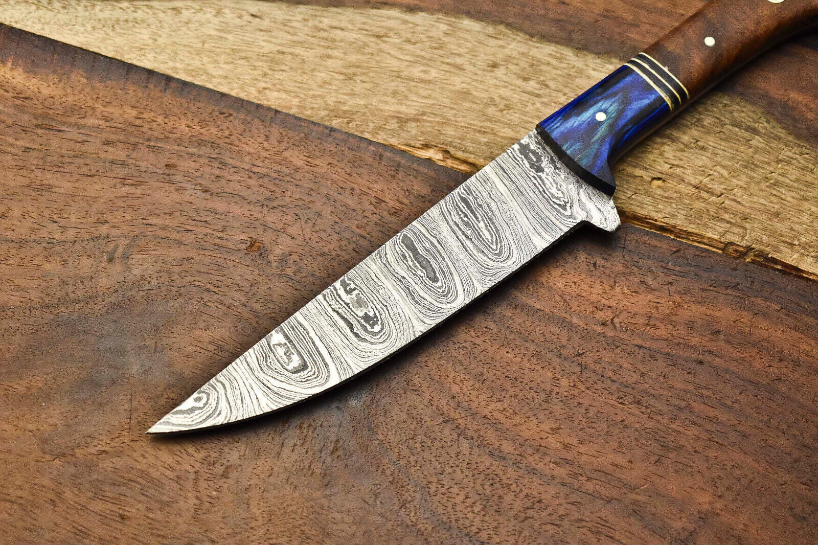 This custom handmade Damascus steel chef knife features a full tang design, combining superior strength and precision for kitchen and outdoor use. With an overall length of 10.0 inches, it includes a 5.0-inch blade and a 5.0-inch handle for balanced performance. The blade is oil-tempered to a Rockwell hardness of 58–60 HRC, with edges sharpened at a precise 20-degree angle. Crafted from 1095 high carbon steel and 15N20 nickel steel, the 384-layer Damascus pattern is not just for aesthetics—it offers excellent edge retention and cutting performance. The process includes repeated folding and acid etching to reveal the rich, wavy steel patterns that Damascus is known for. Each knife is entirely handcrafted without CNC machining, making every piece one-of-a-kind. The polished blade and handle add a refined finish, while maintaining a functional and reliable edge. Whether for your kitchen, field use, or collection, this knife represents craftsmanship and durability at its finest.