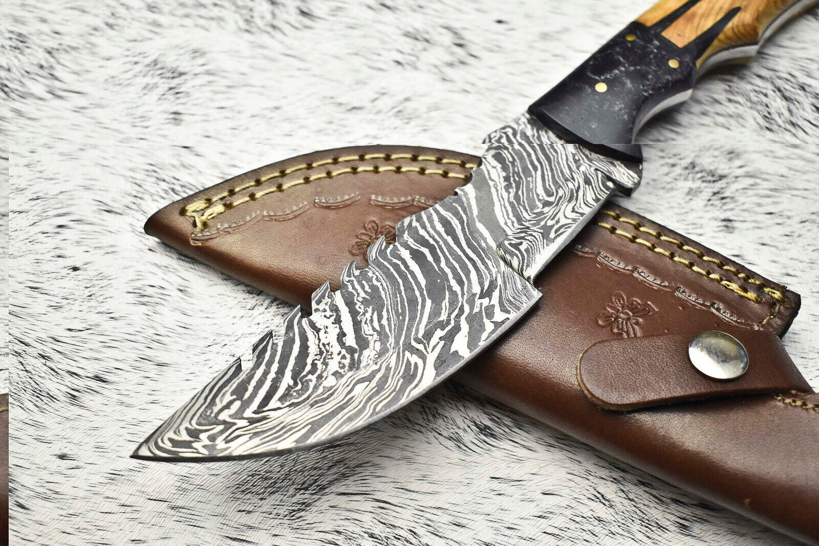 This Custom Handmade Damascus Steel Blade Tracker Knife is a rare masterpiece crafted with precision and strength, built for collectors and outdoor enthusiasts alike. With an overall length of 10 inches, including a 5-inch blade and 5-inch handle, this tracker knife is perfectly balanced for performance. The blade is oil tempered to 58–60 HRC and sharpened at a 20-degree edge angle, ensuring excellent sharpness, durability, and reliability.Forged from a blend of 1095 high carbon steel and 15N20 nickel steel, this blade boasts 384 layers of Damascus steel, achieved by folding the billet multiple times. Once acid-etched, the contrasting nickel and carbon layers are revealed, showcasing the stunning Damascus pattern. The hardwood handle is finely polished, offering both beauty and a secure grip for long-lasting use. This knife comes complete with a high-quality handmade cowhide leather sheath, designed for safe storage and convenient carry. Each knife is 100% handmade, with unique patterns and craftsmanship, making it a perfect companion for hunting, camping, survival, or as a striking addition to any knife collection.