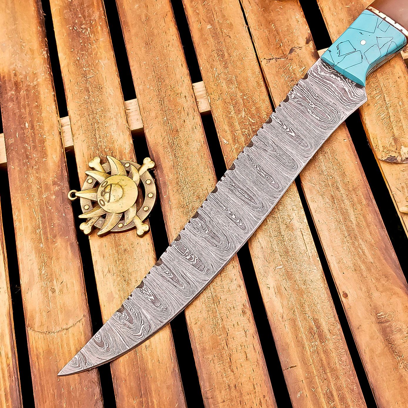 The elegant handle is crafted from premium wood with brass pins, offering a secure grip and timeless style. Each knife comes complete with a hand-tooled thick leather sheath, designed for rugged use and longevity in the outdoors.