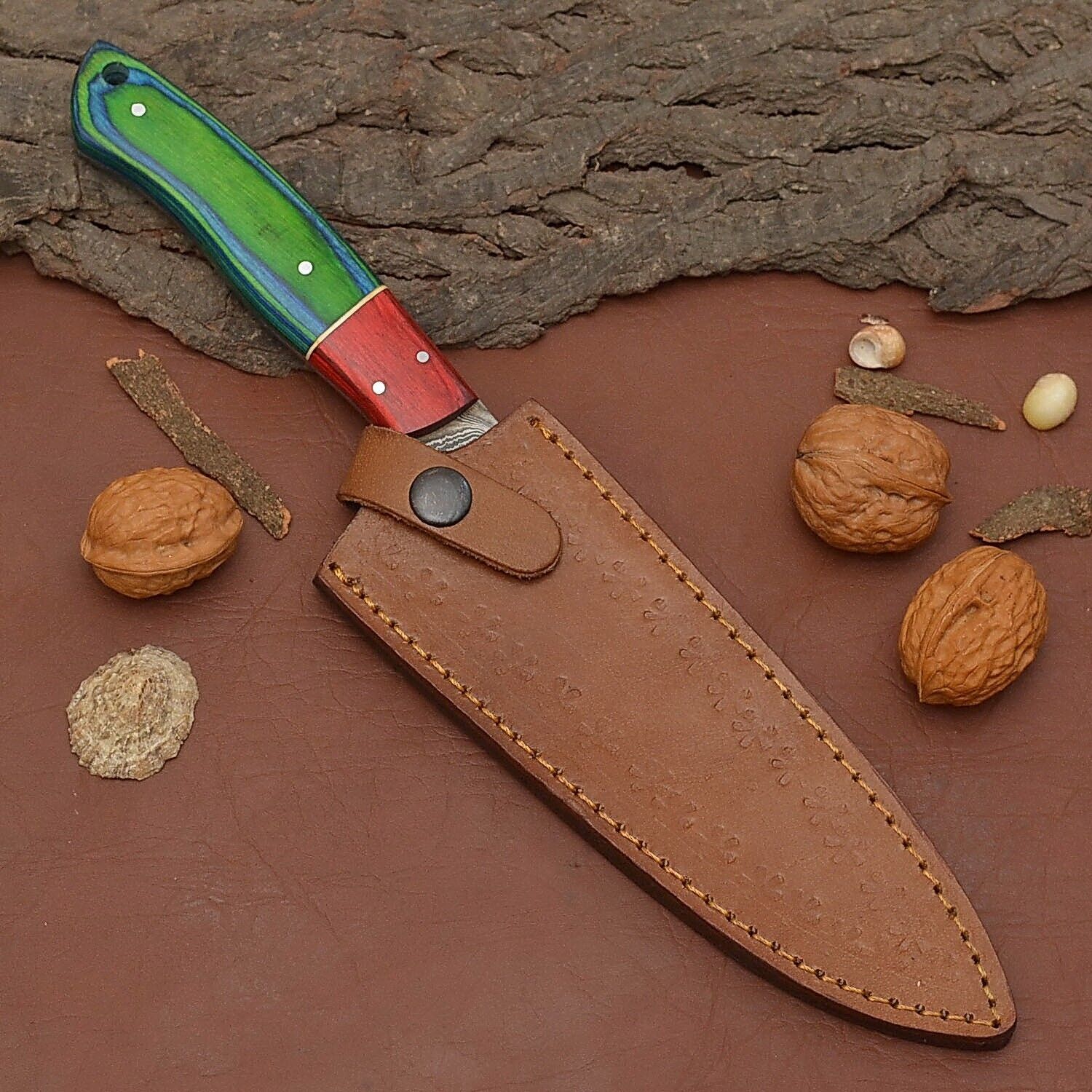 Blade Material: Damascus Steel (15N20 & 1095) Handle Material: Pakka Wood with Wood Bolster Blade Length: 7 inches Handle Length: 5 inches Overall Length: 12 inches Blade Hardness: 58–60 HRC Blade Pattern: Twist Sheath: Genuine Leather Uses: Perfect for kitchen tasks, hunting, camping, survival, and everyday carry.