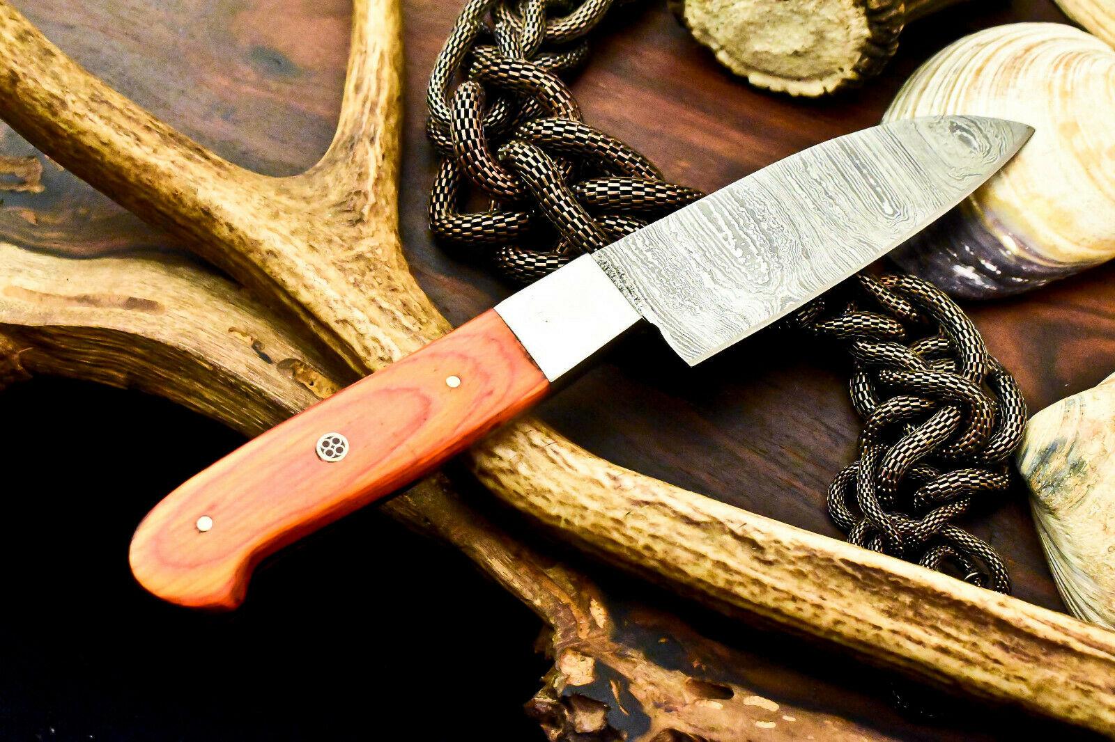 Upgrade your outdoor and kitchen gear with this gorgeous custom handmade Damascus steel chef hunting knife, designed to deliver strength, style, and precision. With an overall length of 9.5 inches, a 5-inch hardwood handle, and a 4.5-inch razor-sharp Damascus blade, this knife is perfect for camping, hunting, or culinary tasks. The blade is oil tempered to 58-60 HRC and edges are sharpened at 20 degrees, ensuring exceptional cutting power and durability. Each knife is forged from a unique blend of 1095 high carbon steel and 15N20 nickel steel, folded and layered over 384 times to achieve the stunning Damascus pattern. This process not only provides a visually striking finish but also ensures superior toughness and edge retention. The high-polished hardwood handle offers a comfortable and secure grip, making it ideal for extended use whether in the kitchen or outdoors. Unlike mass-produced knives, this piece is 100% handmade without CNC machining, ensuring each knife has its own unique character and craftsmanship. Whether you’re a chef, a hunter, or a collector, this Damascus steel knife is a true work of art that combines functionality with beauty. Add this versatile blade to your collection today and enjoy a knife that’s built to last a lifetime.