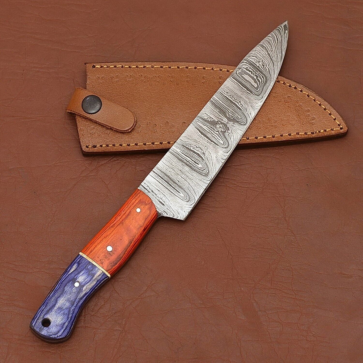 Custom Handmade Damascus Steel Chef Kitchen Knife | 12" Wood Handle with Leather Sheath