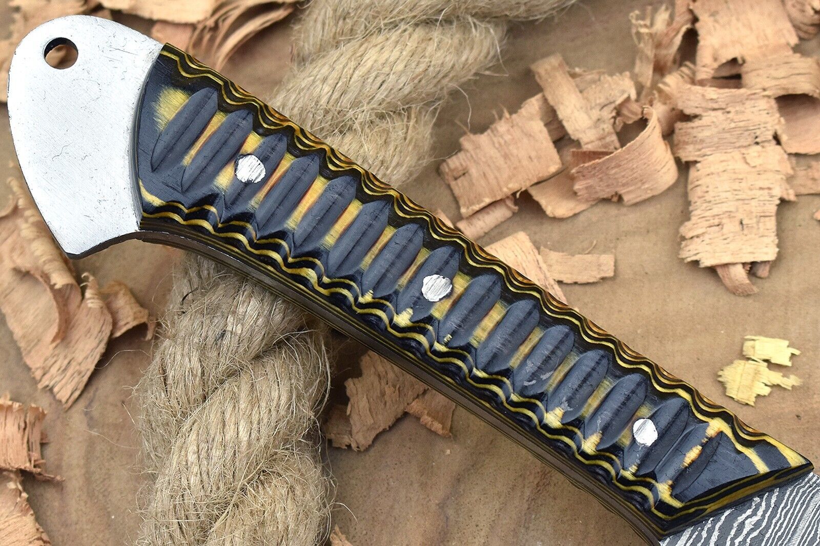 The blade is crafted from premium Damascus steel with a beautiful pattern, ensuring both strength and lasting edge retention. Its striking handle, made from Yellow & Black Dollar Sheet with a Sturl Open Tang design, offers a comfortable and secure grip, perfect for extended kitchen use.