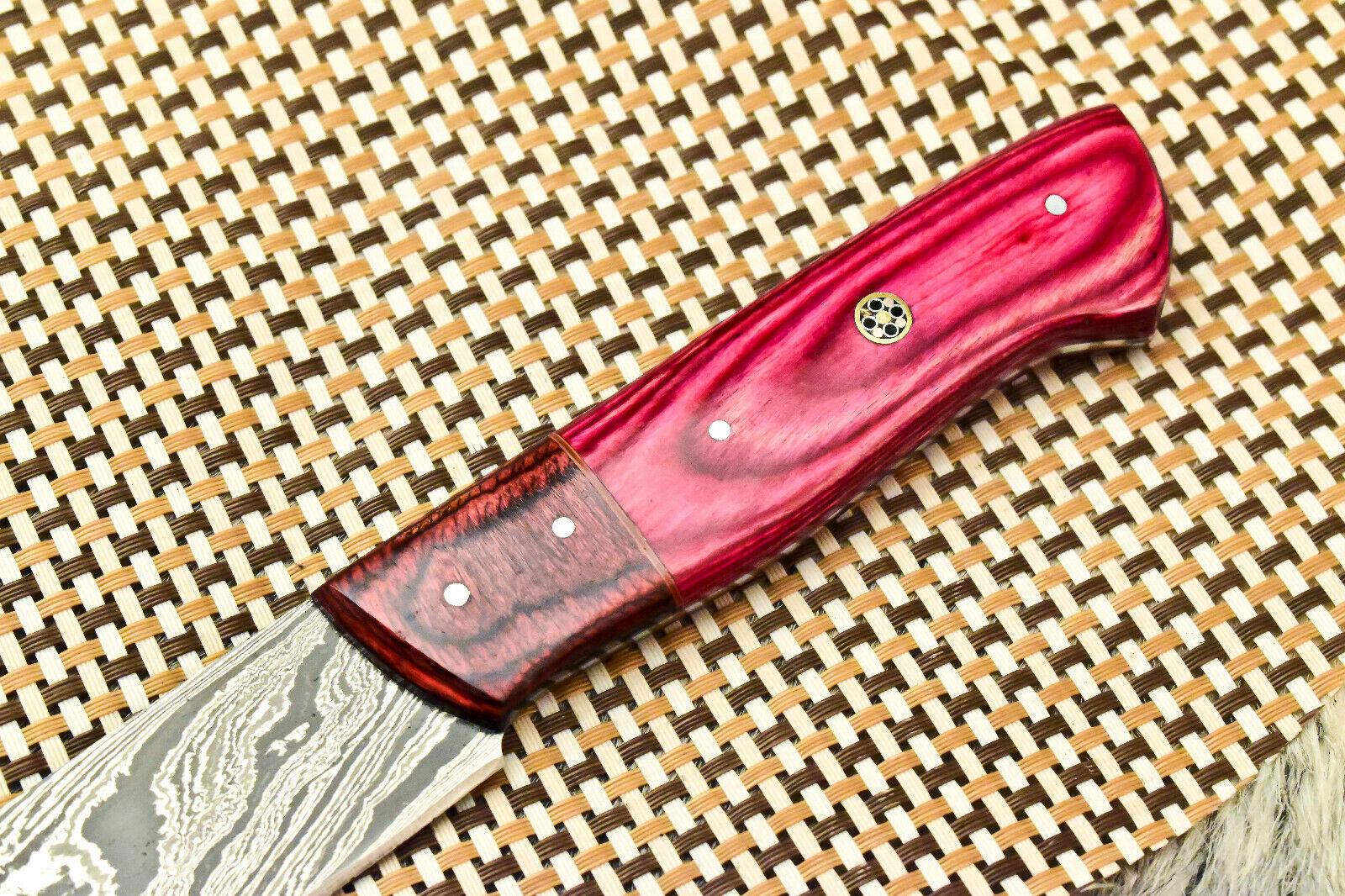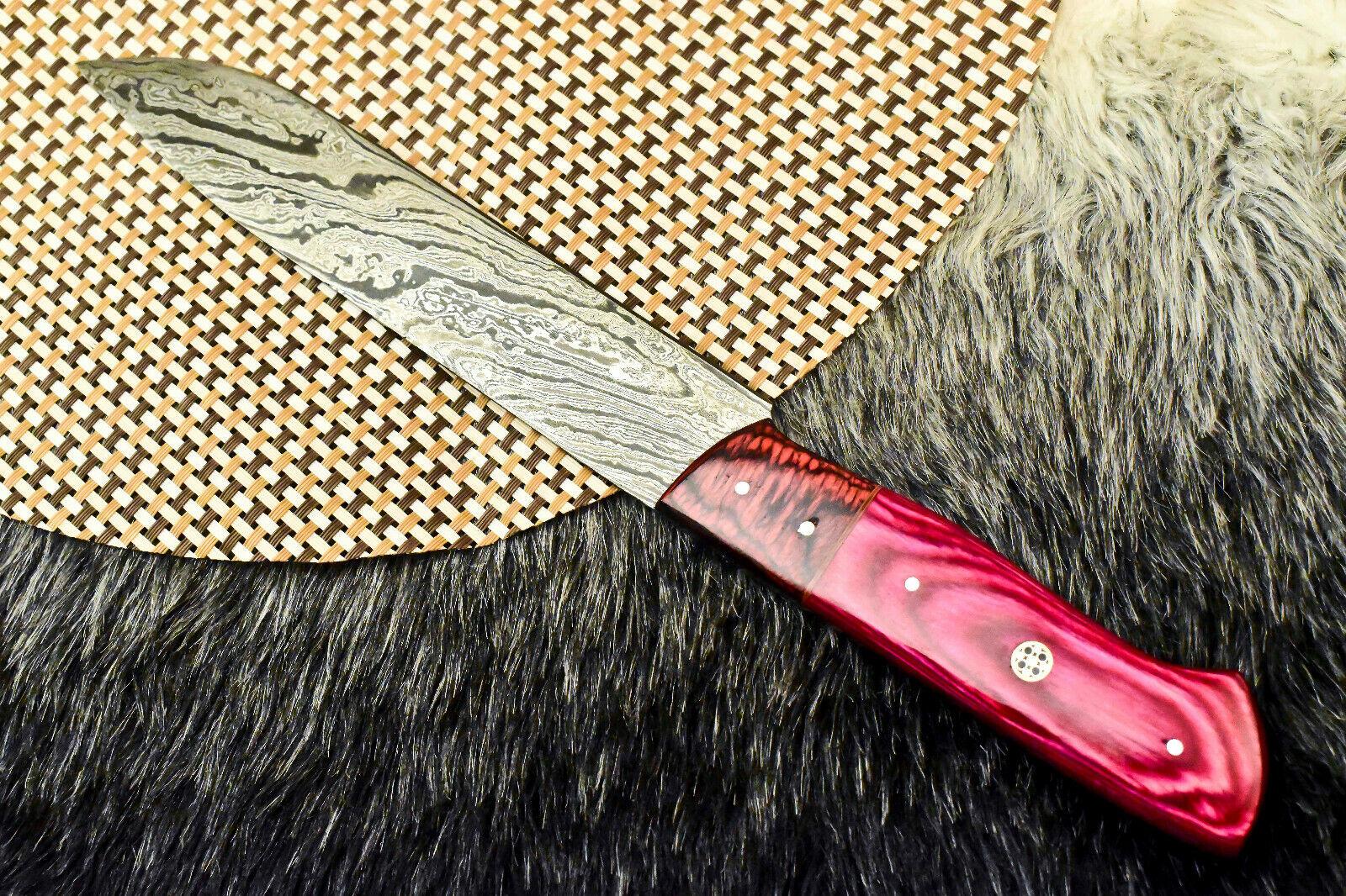 This custom handmade Damascus steel chef knife is a perfect blend of craftsmanship, strength, and elegance. Featuring a full tang design, the knife has an overall length of 12 inches with a 7-inch razor-sharp blade and a 5-inch handle made from genuine camel bone. The blade is oil tempered to 58–60 HRC and sharpened at a precise 20-degree edge, ensuring superior cutting performance and durability for years to come.Crafted from a combination of 1095 high carbon steel and 15N20 nickel carbon, the Damascus blade is folded multiple times to create approximately 384 unique layers. Each blade undergoes an acid etching process, which highlights the distinctive dark-and-light pattern that Damascus steel is renowned for. This not only enhances the knife’s visual appeal but also creates a microscopic saw-tooth effect, helping it stay sharp longer than conventional blades.The polished camel bone handle is both comfortable and durable, giving the knife a natural grip and timeless aesthetic. Every knife is 100% handmade by skilled artisans without the use of CNC machines, ensuring each piece is truly one-of-a-kind. Whether used in the kitchen, outdoors, or added to a collection, this Damascus chef knife is a functional work of art built to last.