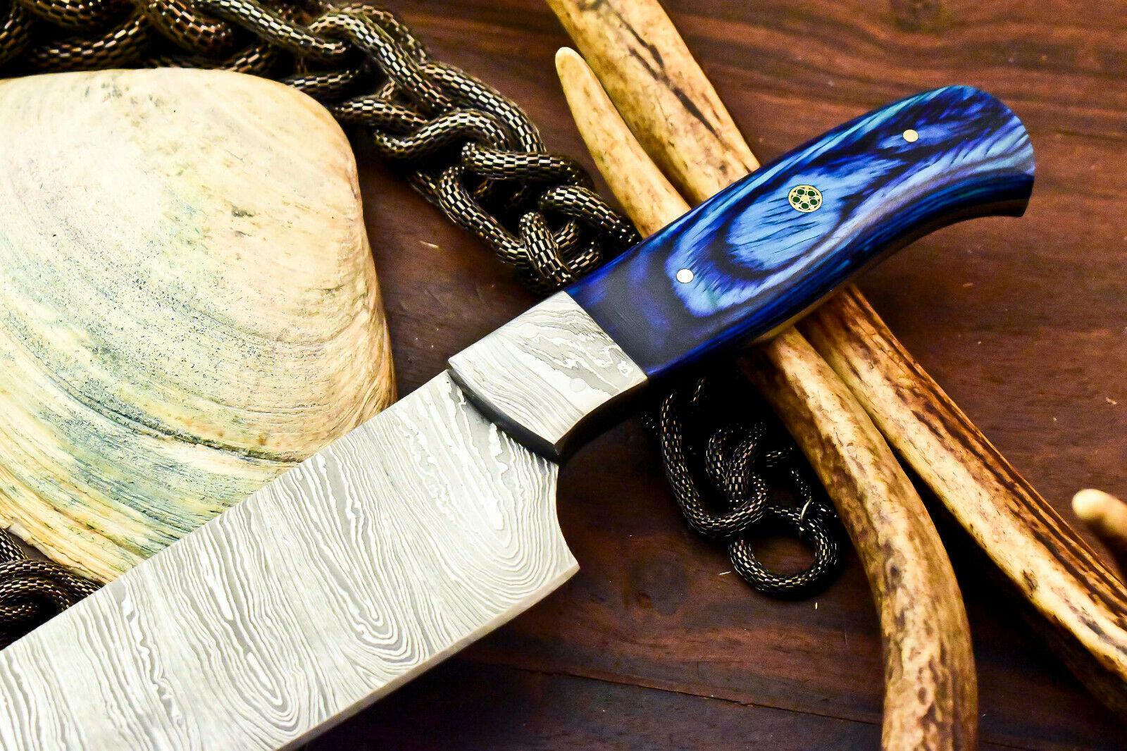 This custom handmade Damascus steel chef knife is a true blend of craftsmanship, durability, and elegance. Measuring 12 inches overall, it features a 7.5-inch blade and a 4-inch hardwood handle, offering perfect balance for both kitchen and outdoor use. The blade is forged from a mixture of 1095 high carbon steel and 15N20 nickel steel, folded repeatedly to achieve 384 layers, resulting in the distinctive Damascus pattern. Unlike acid-etched imitations, our Damascus is authentic, with natural patterns revealed through acid burning. Each layer adds both strength and beauty, ensuring your knife is not just functional but also a unique work of art. The blade is oil tempered to 58–60 HRC, making it exceptionally tough and capable of retaining a razor-sharp edge even under demanding use. Sharpened at 20 degrees, it provides precision for slicing, chopping, and detailed cutting tasks. The full tang construction guarantees maximum strength, while the polished hardwood handle ensures a comfortable, ergonomic grip. Every knife is 100% handmade and individually finished, meaning no two knives are exactly alike. Whether you’re a professional chef, collector, or outdoors enthusiast, this Damascus chef knife with hardwood handle is built to perform and designed to impress.