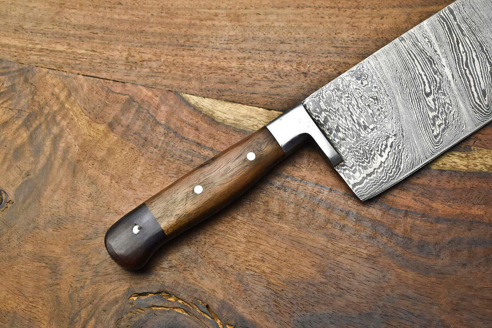 Experience craftsmanship at its finest with this Custom Handmade Damascus Steel Chef Knife featuring a durable Full Tang Sport Blade. This knife is made using genuine Damascus steel, forged from a blend of 1095 high carbon and 15N20 nickel steel. The process involves repeated folding to achieve 384 distinctive layers, ensuring strength, durability, and a unique pattern. After forging, the blade is acid-etched to reveal the intricate Damascus layers, where nickel appears satin and the carbon steel shows a blackish-grey contrast. Each knife is carefully hand-polished, with handles finished to a smooth shine and blades sharpened to a fine edge. This combination of art and utility makes it a perfect tool for chefs, collectors, and outdoor enthusiasts alike. 100% handmade with precision and care, this knife is not just a tool — it's a statement of quality and tradition.