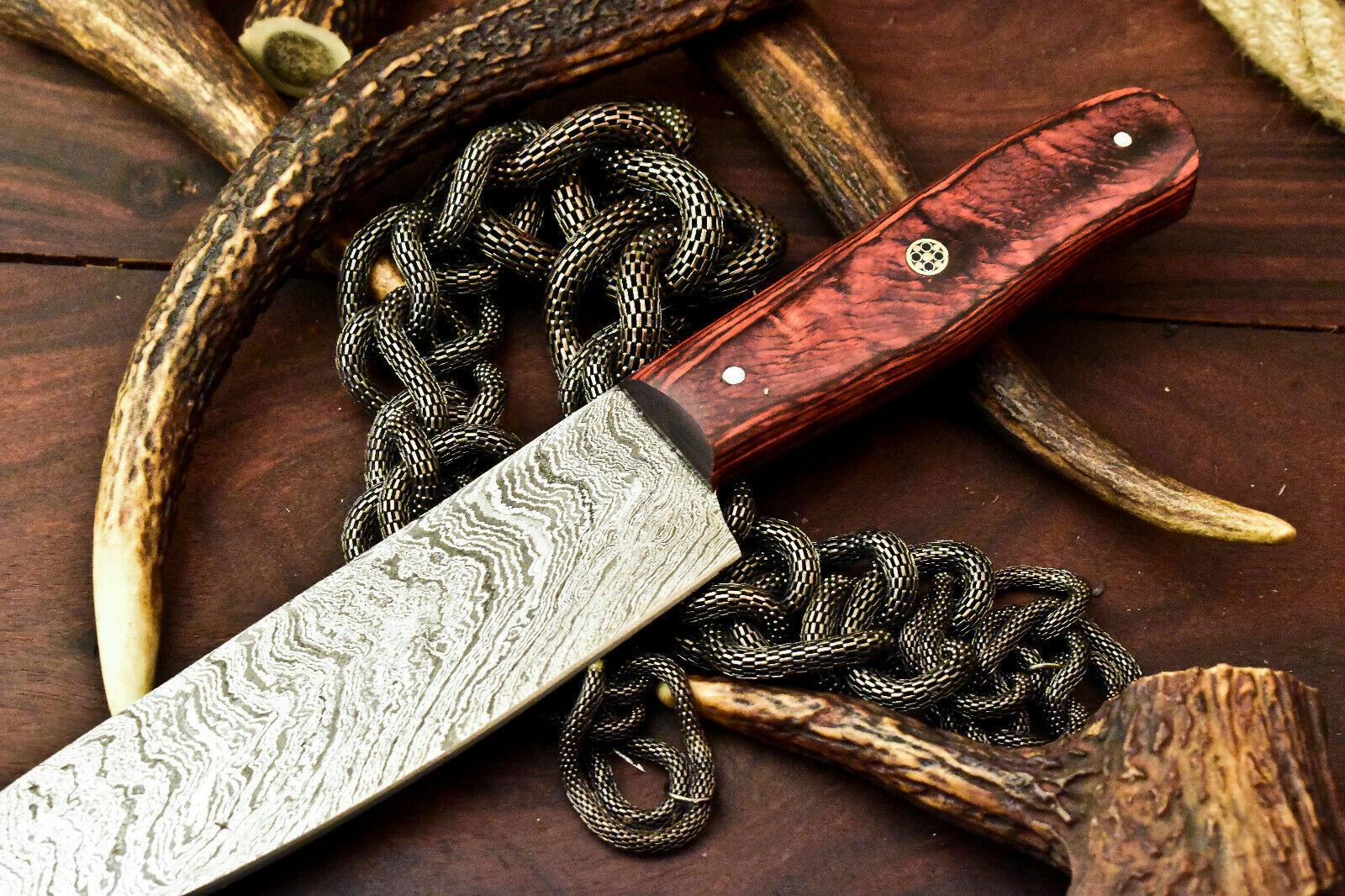 This custom handmade Damascus steel chef knife is a masterpiece of craftsmanship, built to deliver exceptional strength, sharpness, and beauty. Featuring a full tang construction, the knife offers balance and durability for precise cutting performance. The blade is forged from genuine Damascus steel, a combination of 1095 high carbon steel and 15N20 nickel steel, folded over 384 times to create unique and striking layers. Each knife is acid-etched to highlight its natural Damascus pattern, making every piece truly one of a kind. The razor-sharp edge is professionally sharpened at a 20-degree angle, ensuring excellent cutting ability for all your kitchen needs. The handle is crafted from premium hardwood, polished to perfection for a comfortable and secure grip. With a hardness of 58–60 HRC after proper heat treatment, this chef knife is designed to last and perform at the highest level. 100% handmade by skilled artisans, it is not just a tool but also a collectible piece of art. Whether you are a professional chef, cooking enthusiast, or knife collector, this Damascus steel full tang chef knife is an essential addition to your collection.