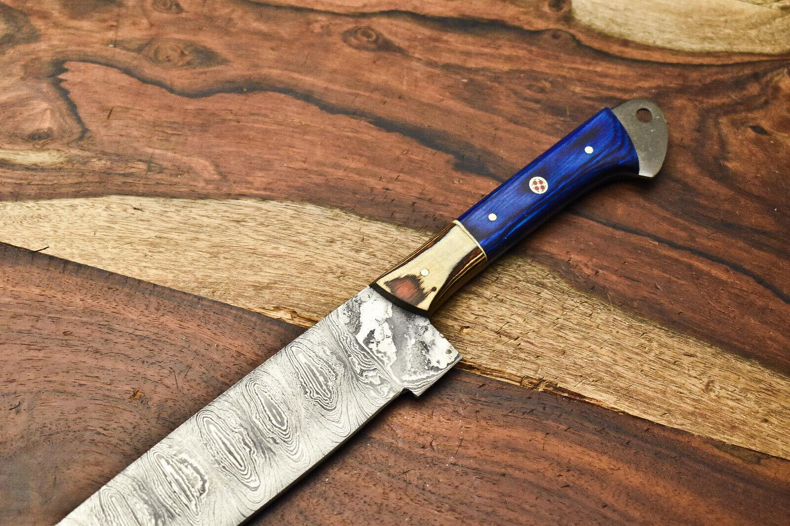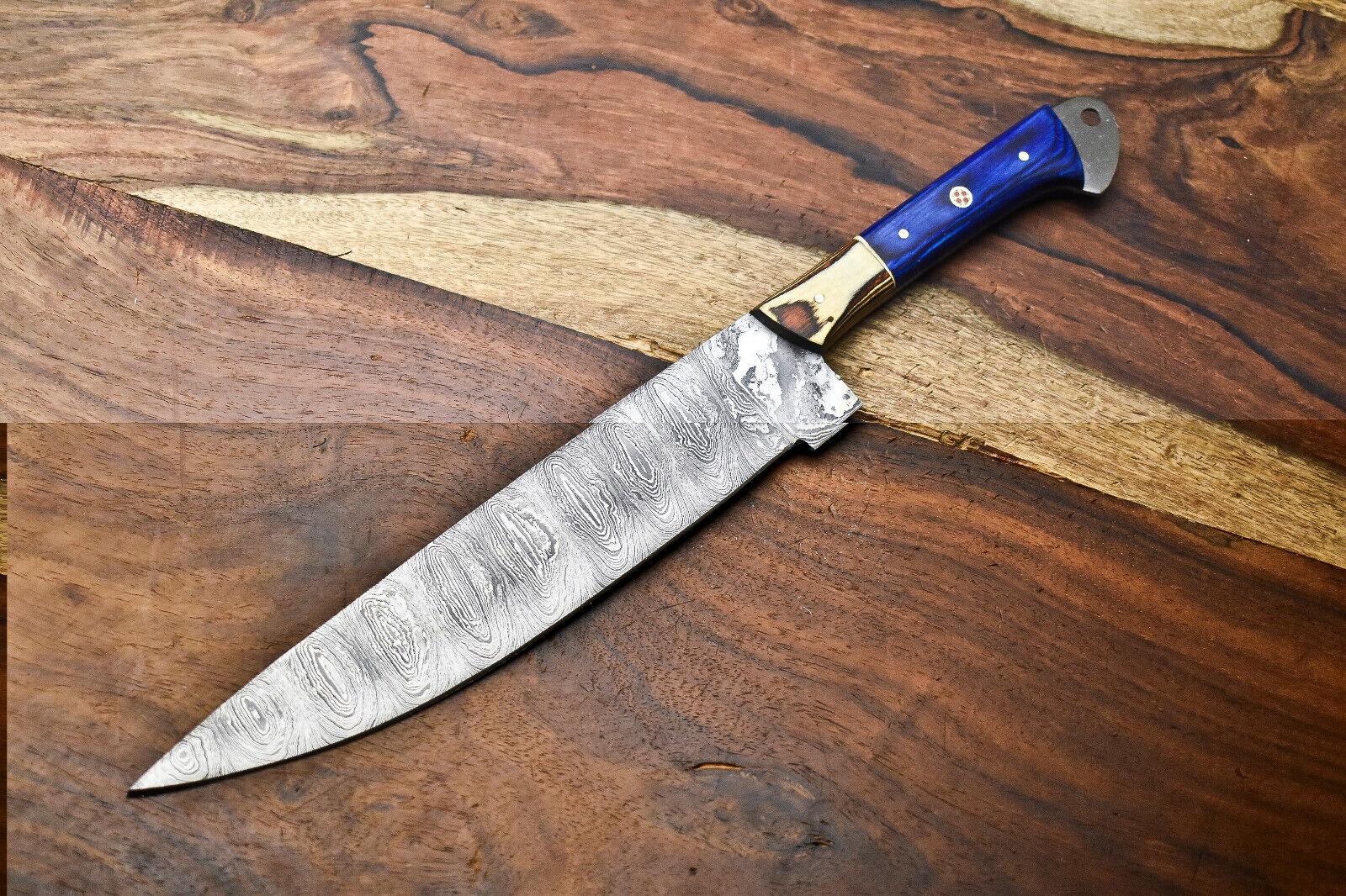 This Handmade Damascus Steel Blade Chef Full Tang Knife is a perfect blend of strength, sharpness, and craftsmanship. Forged from a combination of 1095 high carbon steel and 15N20 nickel carbon steel, the blade features approximately 384 layers that are folded and hammered to create the striking Damascus pattern. The acid etching process enhances the contrast, turning the nickel into a satin finish while the high carbon areas develop a rich blackish-gray tone, revealing the unique wave-like patterns of Damascus steel. Designed for durability and precision, the full tang construction ensures balance and control, while the polished handle provides comfort and a secure grip. Whether used in the kitchen or as a collector’s piece, this Damascus chef knife is both functional and visually stunning, making it an excellent tool for chefs, hunters, and enthusiasts alike.