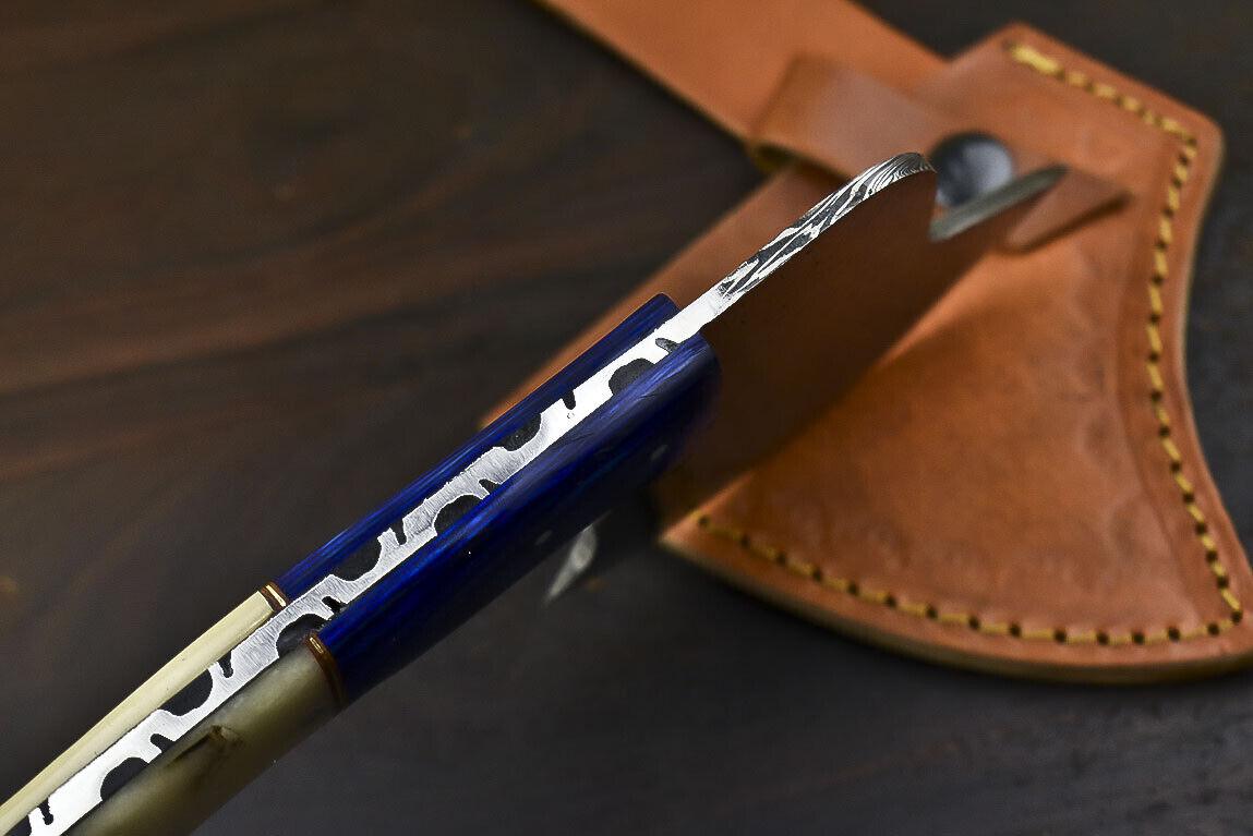 The handle is crafted from genuine camel bone, polished smooth for comfort and strength. Its ergonomic design provides a secure grip, even during extended use. Each custom Damascus axe comes complete with a handcrafted leather sheath for safe carrying and storage. Perfect for collectors, hunters, or outdoor enthusiasts, this Damascus cleaver chopper axe knife is both a functional tool and a stunning display piece.