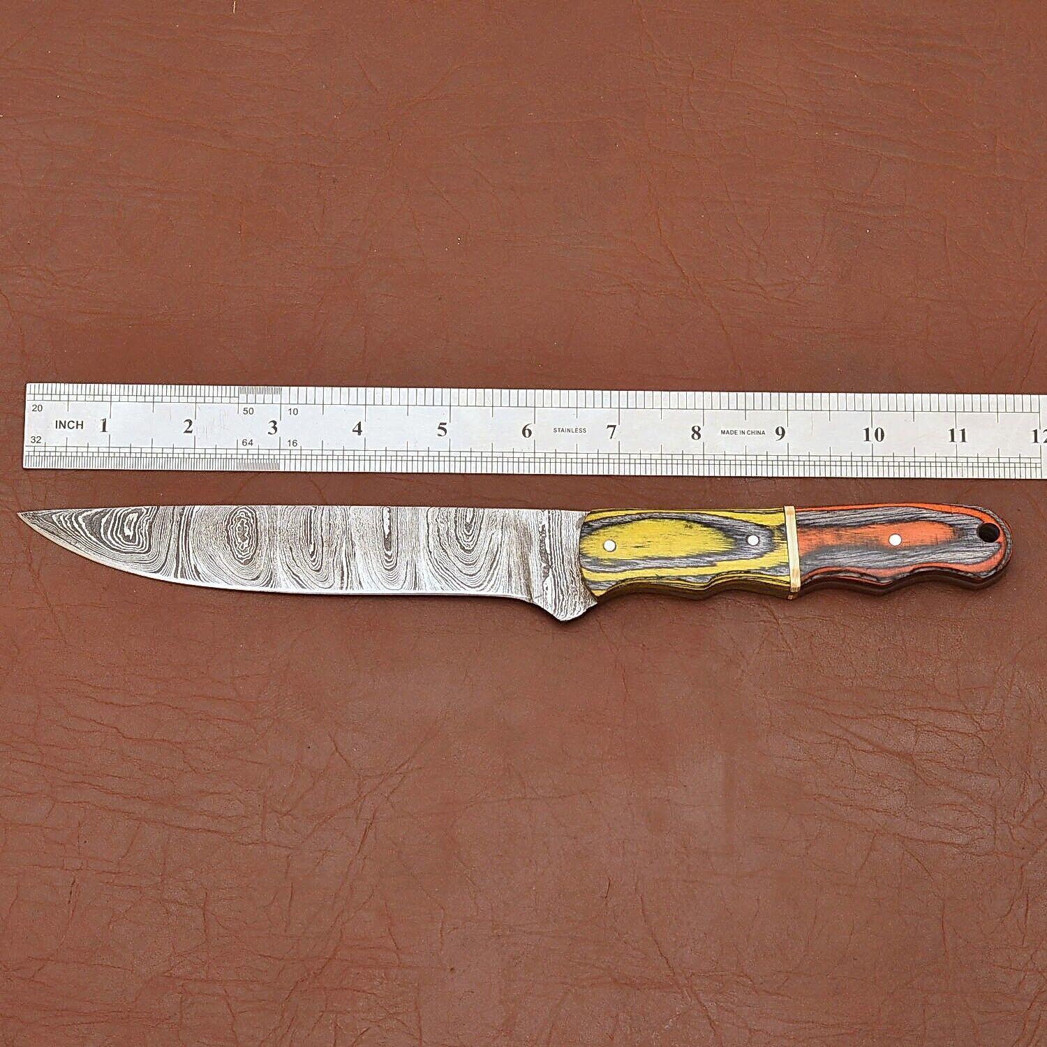 The 5-inch handle is crafted from premium wood with a sturdy wood bolster, ensuring a secure and comfortable grip even during extended use. Ideal for both professional chefs and outdoor enthusiasts, this knife excels in the kitchen as well as in hunting, camping, and survival situations.