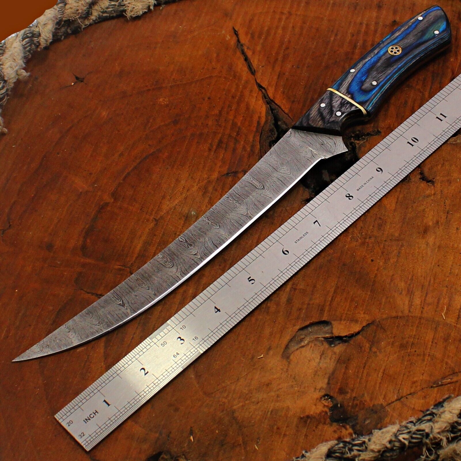 Our Custom Handmade Damascus Steel Fillet Chef Brisket Kitchen Hunting Knife, a premium quality damascus fillet knife designed for professional chefs, butchers, hunters, and fishing enthusiasts. This high performance damascus steel fillet knife delivers precision slicing whether you're preparing brisket, filleting fish, or handling outdoor tasks. Perfect for kitchen use, this blade also works as a damascus fishing knife, damascus filleting knife, and damascus fish knife. If you are searching for the best fillet knife or a reliable good fillet knife, this handcrafted masterpiece is built to exceed expectations. Our collection of handmade fillet knives combines beauty, strength, and functionality, making this an ideal custom fillet knife for professionals and collectors alike.